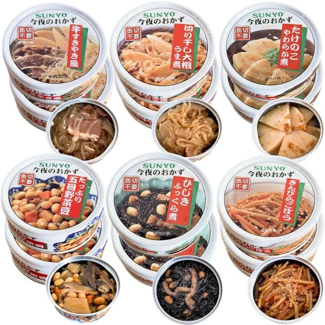 サンヨー堂 美味しい おかず 缶詰 24缶 セット (6種×各4個)ひじき煮/たけのこ煮/五目野菜豆/切干大根/きんぴらごぼう/牛すきやき 防災食 非常食 保存食 巣ごもり 食品 備蓄食料 買い置き 在宅 地震 災害 対策 災害 SUNYO サンヨー