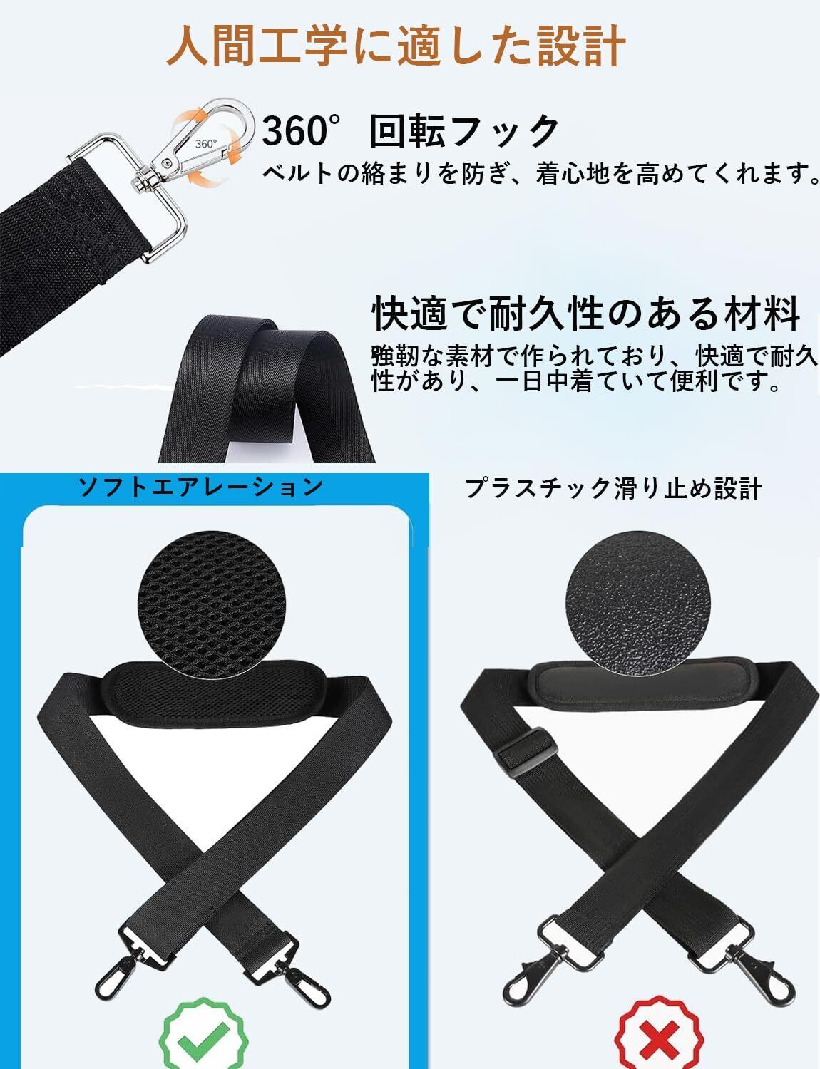 【幅広い用途】この製品は、カメラバッグ、コンピューター/タブレットバッグ、機材バッグ、ビジネスバッグ、スリーブ/ブリーフケース、ショルダーバッグ、スポーツバッグなど、ほとんどのバッグ製品に適したユニバーサルスペア/交換用ショルダーストラップです。 ストラップの両端にはフックとカラビナが付いており、ケースやバッグなどに簡単に取り付けたり取り外したりできます。ショルダーストラップのフック部分は360°回転するので、ストラップロープがよじれたりねじれたりしても、すぐに調整して元の位置に戻すことができ、とても便利です。