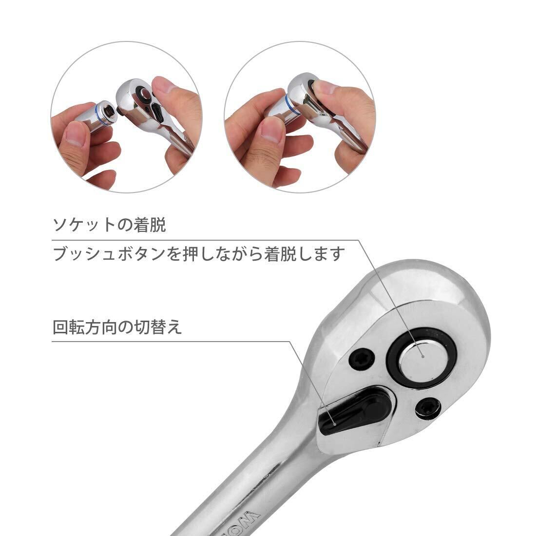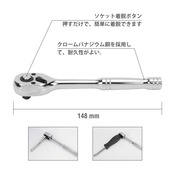 【特徴】ラチェットハンドルはクイックリリースのデザインで、ソケットの脱着はボタンを押すだけで簡単にできる。72山ギアを採用しており、細やかな動きが可能で狭い場所での作業は抜群です。