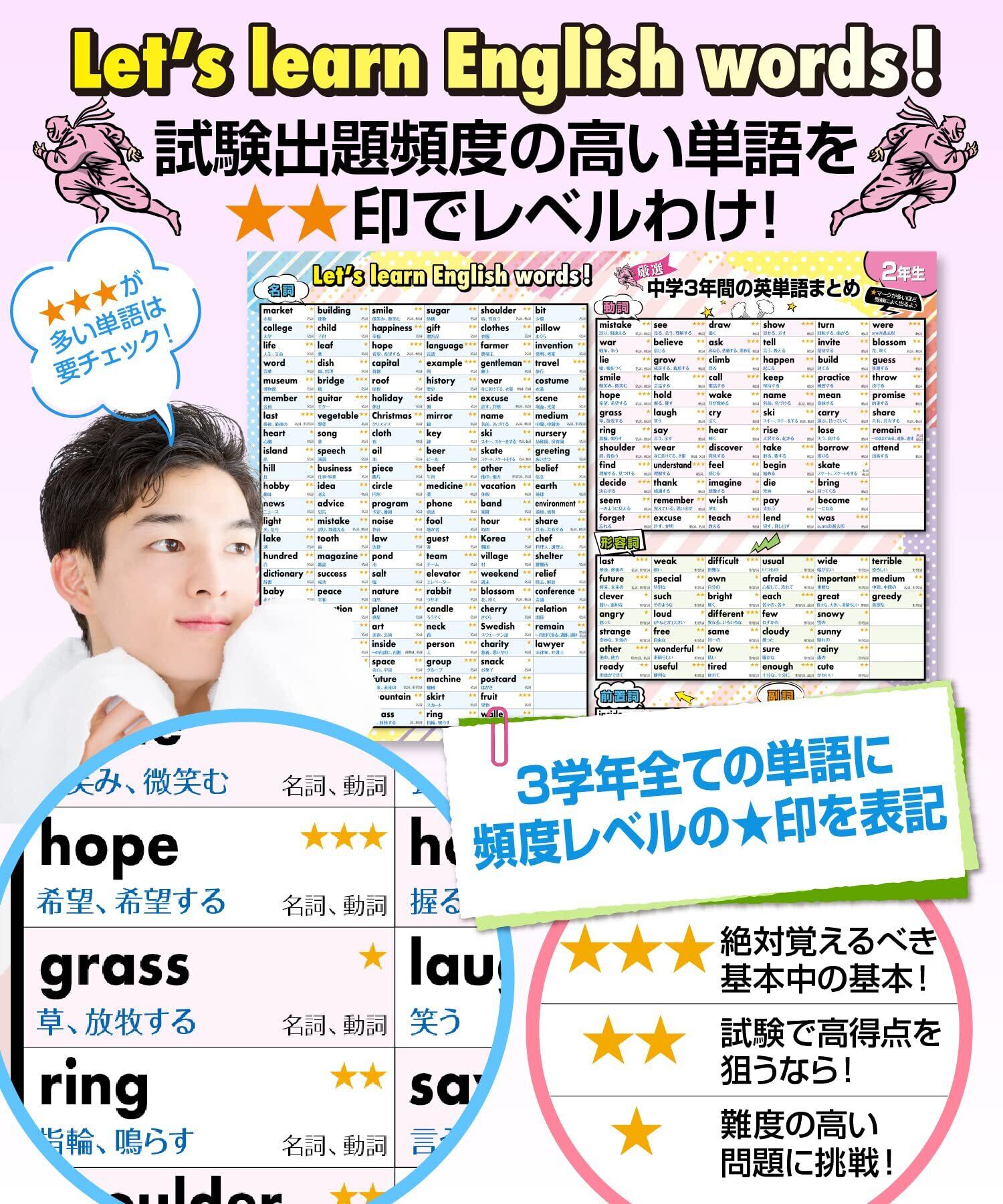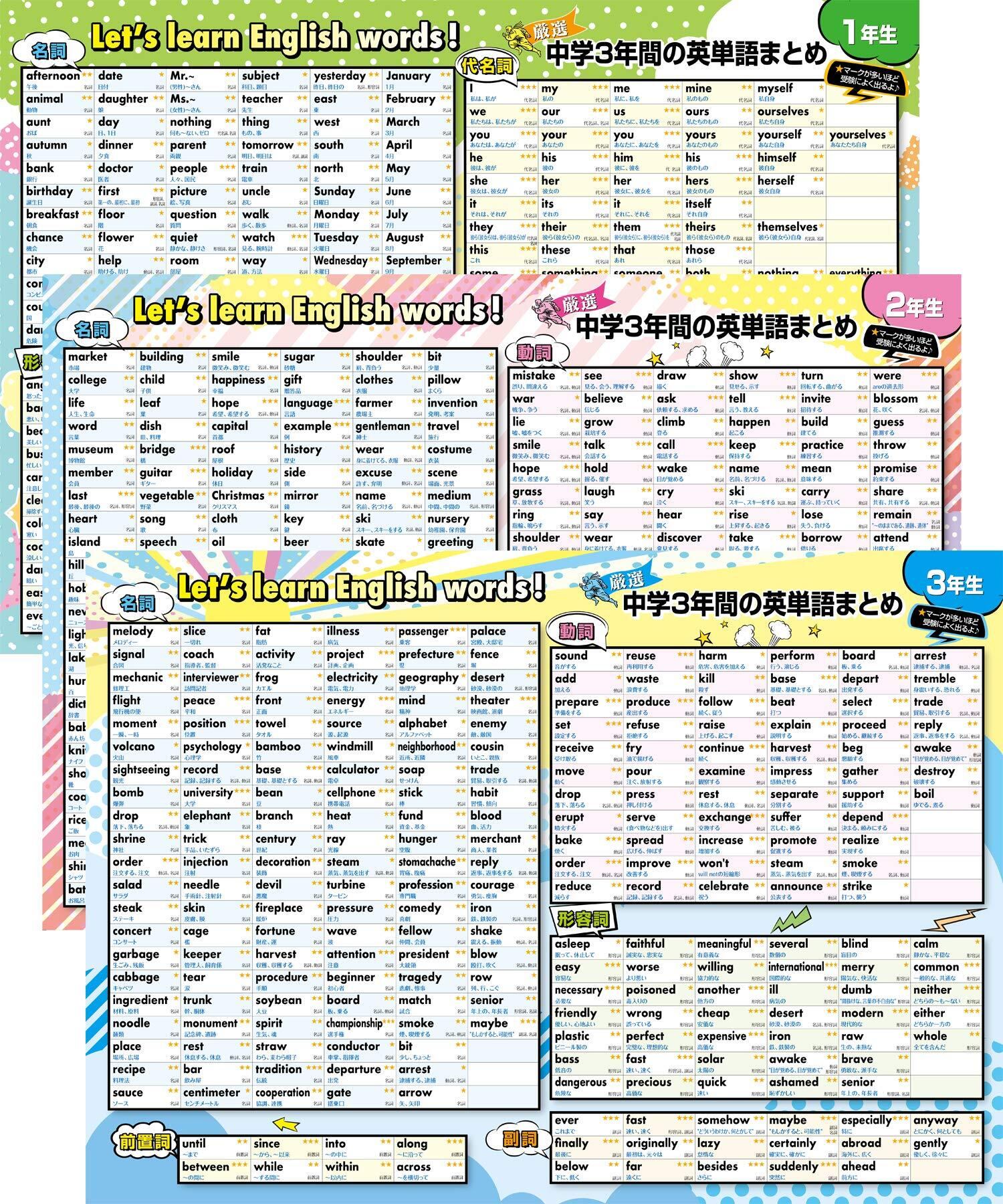 学年ごとに分かれた単語リスト:ポスターは中学1年生から3年生までの学年ごとに分かれており、それぞれの学年で学ぶべき単語が整理されています。これにより、子供たちは自分の学年に合わせた学習を効率的に進めることができます。学年ごとに進度を確認しながら学習を進められる点が大きな特徴です。