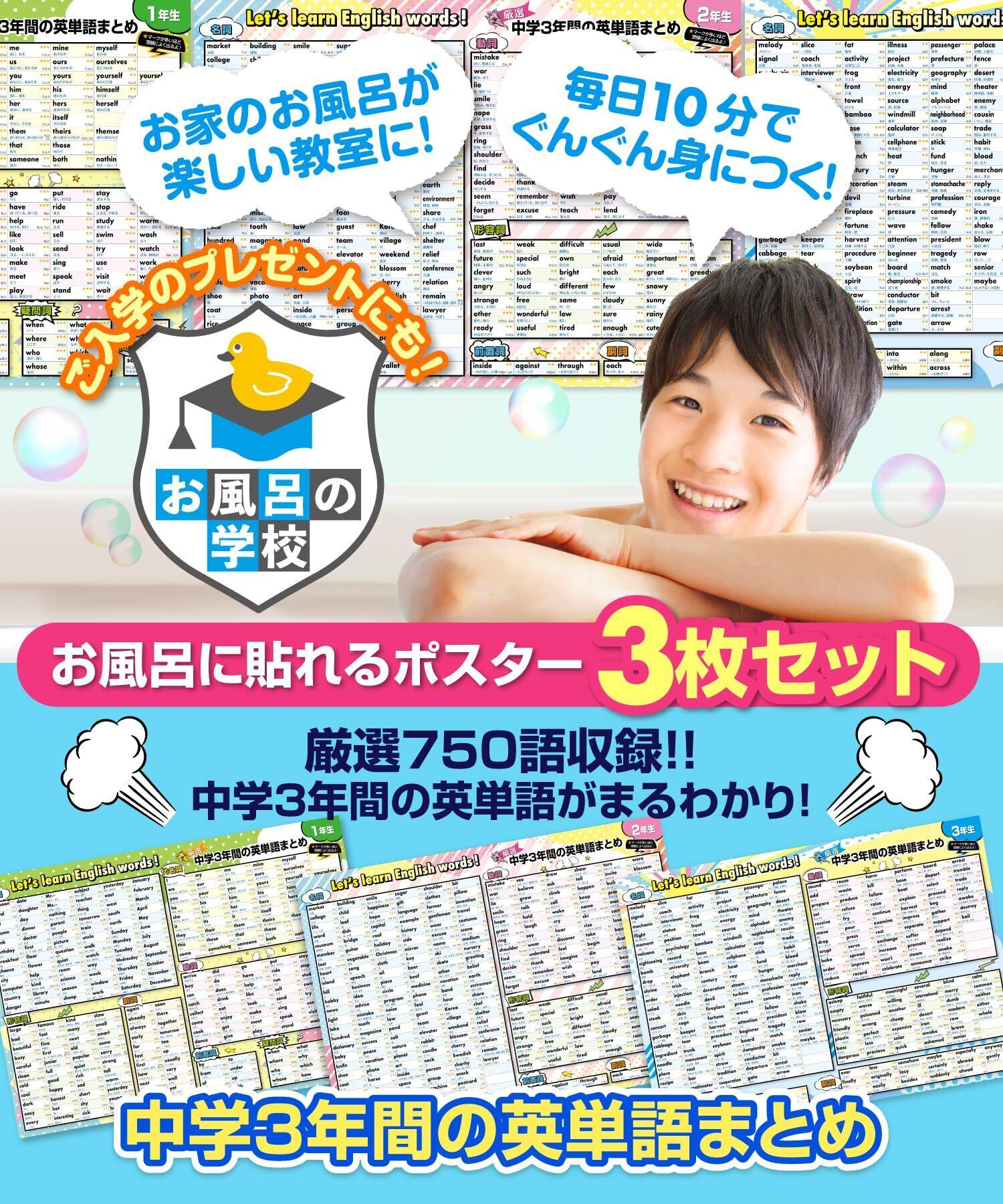 お風呂の学校 中学3年間の英単語まとめ お風呂ポスター 3枚セット 日本製 厳選750語収録 高校受験 TOEIC B3サイズ 英語 単語帳 防水 耐水 学習