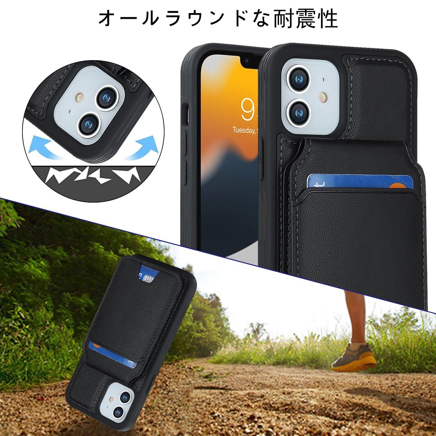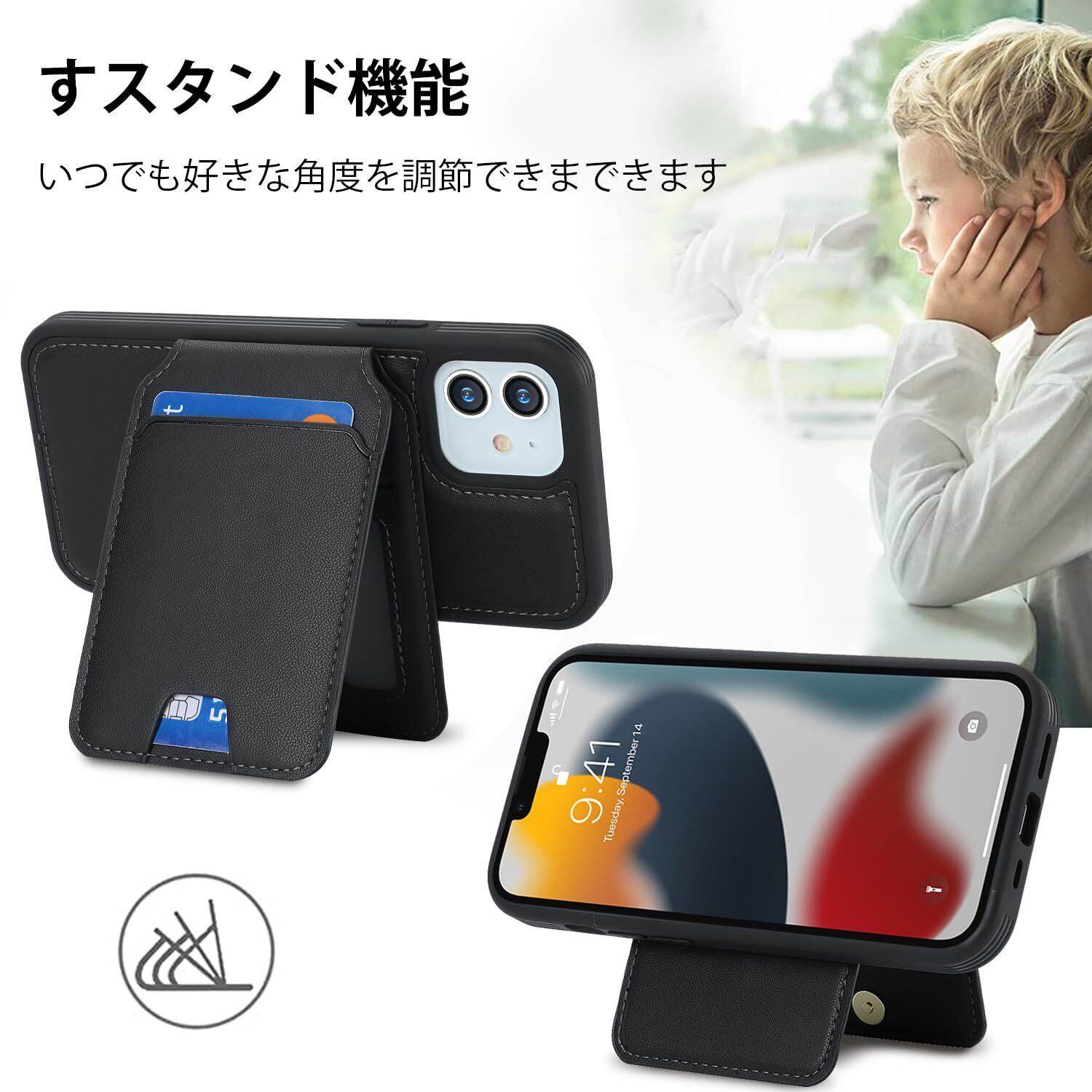 【リムーバブルカードケース】◀ケース背面には取り外し可能な磁気吸引カードケースが付属し、カードを5枚収納できる。たとえば、スイカカードなどの毎日の重要なカードや現金は簡単に保管できます。iPhoneシリーズ専用に設計されているので、ケースを装着したまま、音量ブボタン、カメラ、コネクターなどのを自由に使えます。実用性が高いです。◀横置きスタンド機能:取り外し可能なカードスロットは、横画面でも縦画面でも簡単に実現できる携帯電話スタンドに簡単に変換できます。映画を見たり読んだりすることで手を解放できます。