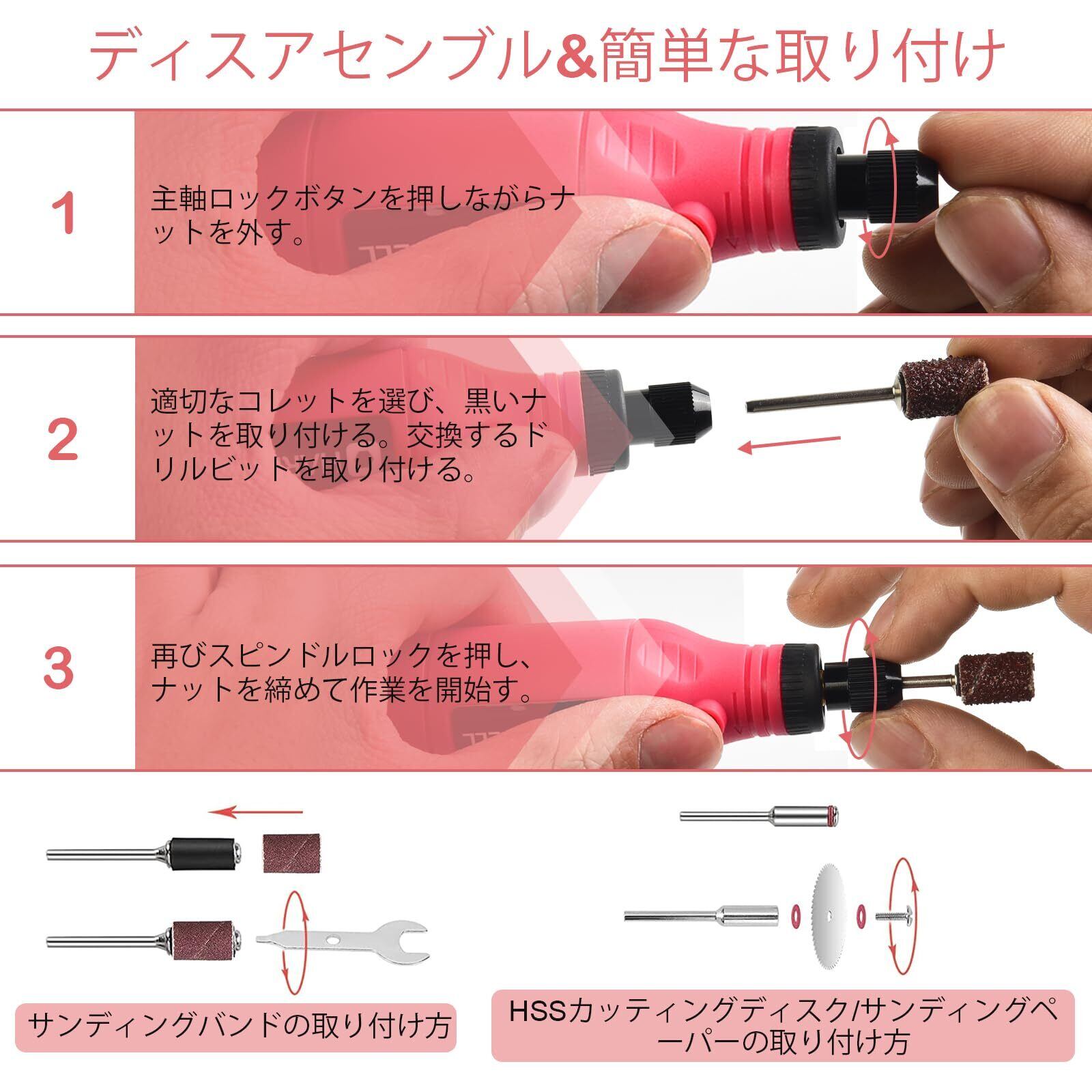HARDELLミニルーター 5段変速 61PCS 18000RPM高速回転 USB充電式ミニ工具セット ルーターツール 電動 軽作業に適した 無線研磨/ポリッシュ/穴あけ/切断/除錆/彫刻/DIY/ネイルスタジオ 照明付き充電式ルーター 日本語取扱い説明書(ピンク)