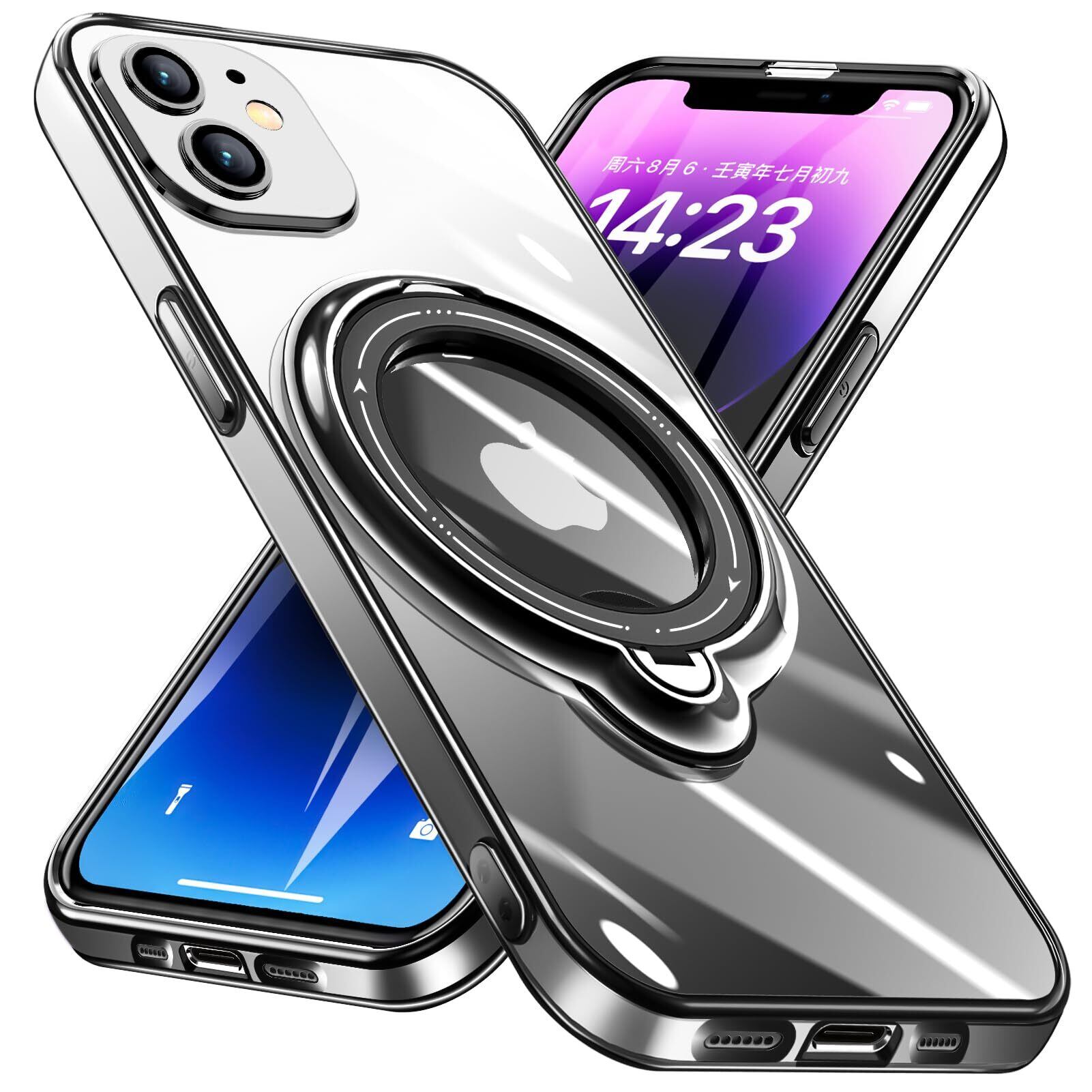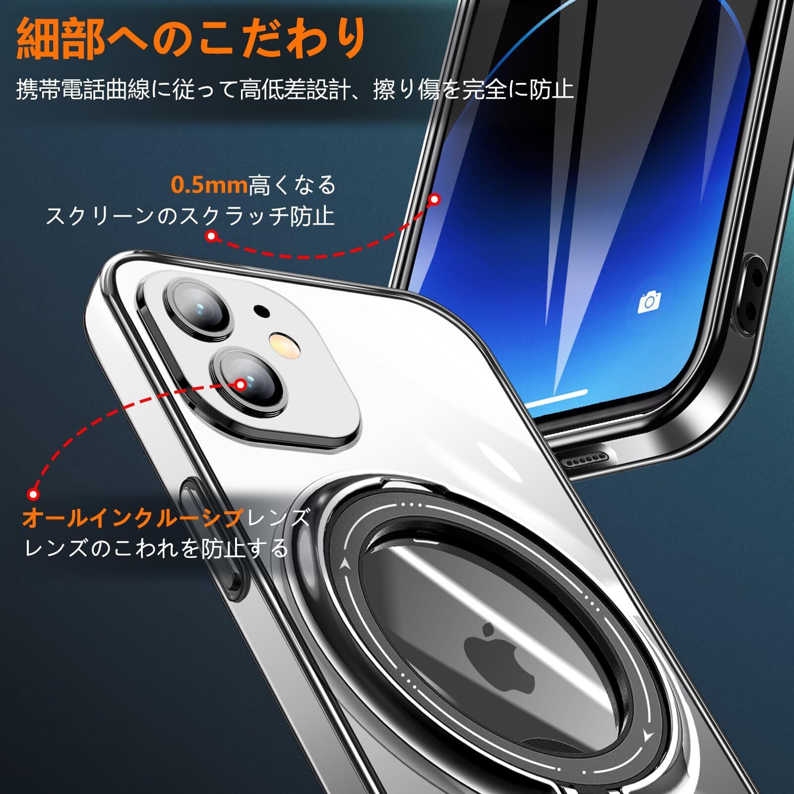 iPhone 12 用 ケース リング付き クリア磁気ケース 耐衝撃 レンズフィルム 高透過率 スタンド機能 角度調整可能 透明 TPU 指紋防止 落下防止 防塵 薄型 軽量 一体型 変形防止 全面保護カバー アイフォン用 ケース 黒 W-DDCX-4-01