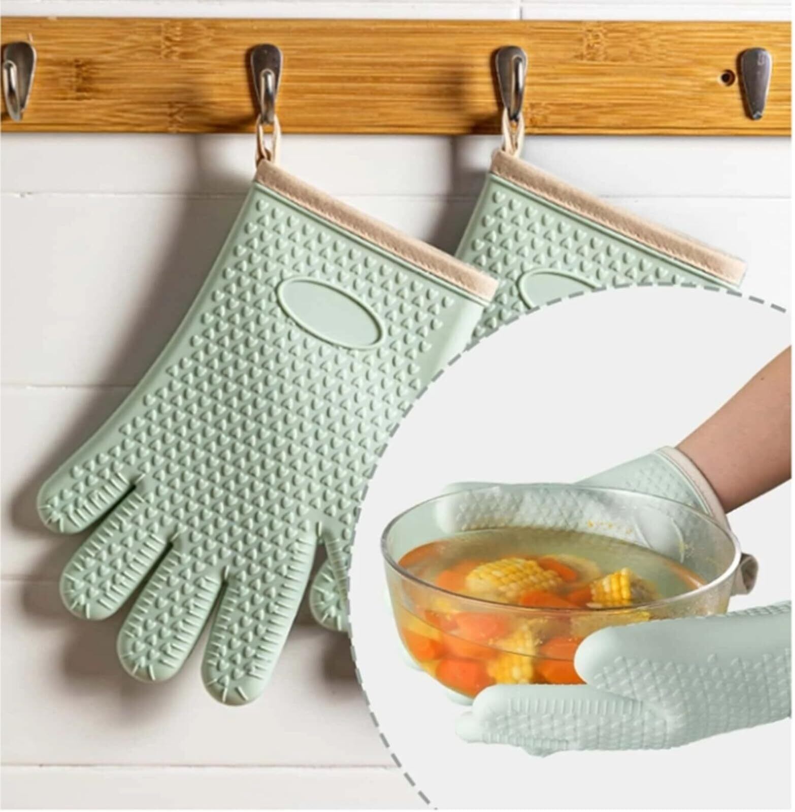 【仕様】サイズ:約28*20cm。重量:約145g1個。 耐熱温度:300℃ 5本指+3層保護シリコーン手袋は、表面に耐熱・耐水シリコーンを使用し、中間に肌触りの良い綿のインナーと断熱性のある裏地を使用しており、通常のオーブン手袋より優れた性能を発揮します。