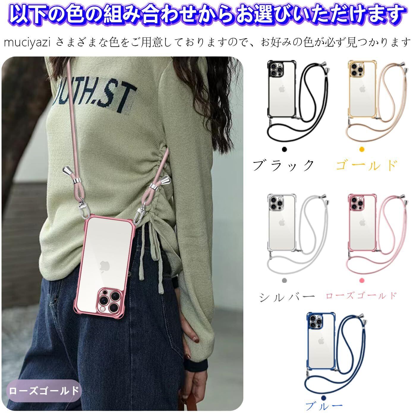 iPhone 16 Pro Max 用 ケース クリア ショルダー iPhone16pro max スマホケース アイフォン16ProMax カバー 肩掛け 斜めかけ 縄掛けケース 透明 薄型 軽量 TPU 携帯ケース 紐付き 斜めがけ 織りストラップ付き 長さ調整可能 取り外し可能 落下防止 紛失防止 ワイヤレス充電対応(ローズゴールド)
