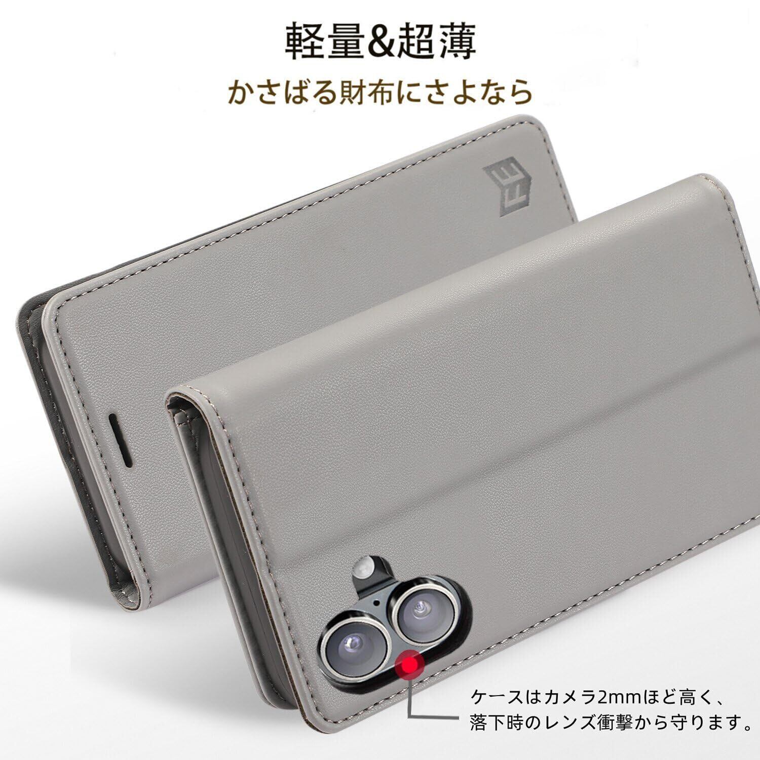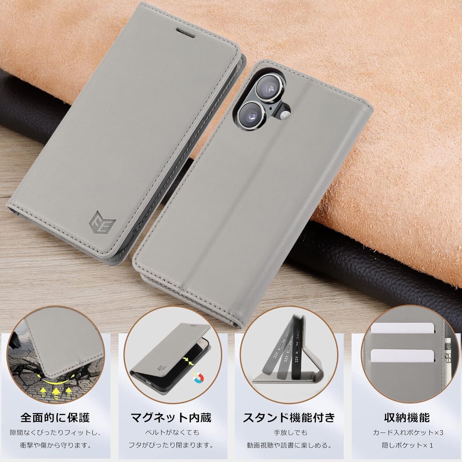 FeeY iphone16ケース 手帳型 Iphone16手帳 ケース 耐衝撃TPU素材カード収納 マグネット内蔵スタンド機能付き アイフォン16携帯カバー全面保護 iPhone 16スマホケース 6.1インチ対応,グレー