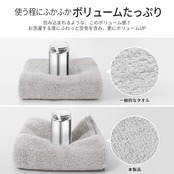 【ふわふわ!肌に優しい】素材に工夫をこらし、無撚糸のような柔らかさとフワフワな肌触りに。包み込まれるような、ボリューム感で使い心地を追求しました。また、糸が支え合うことでパイルが横倒れしにくく、肌にも優しくなりました。