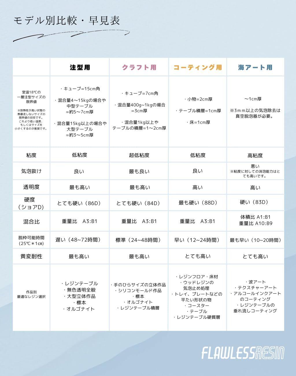 最適な用途 :レジンテーブル、オブジェなどの大きな作品。 標本などの黄変させたくない無色透明の作品など。 ※エポキシ樹脂は硬化時間が長いと表面にシワ模様が発生しやすくなります。更に厚みが薄い、室温が低い、シリコンモールドが柔らかい事なども要因となります。研磨仕上げしない作品の場合は、硬化後・脱枠前に硬化の速いエポキシ樹脂で天面をコーティングするとシワ模様を消すことが出来ます。