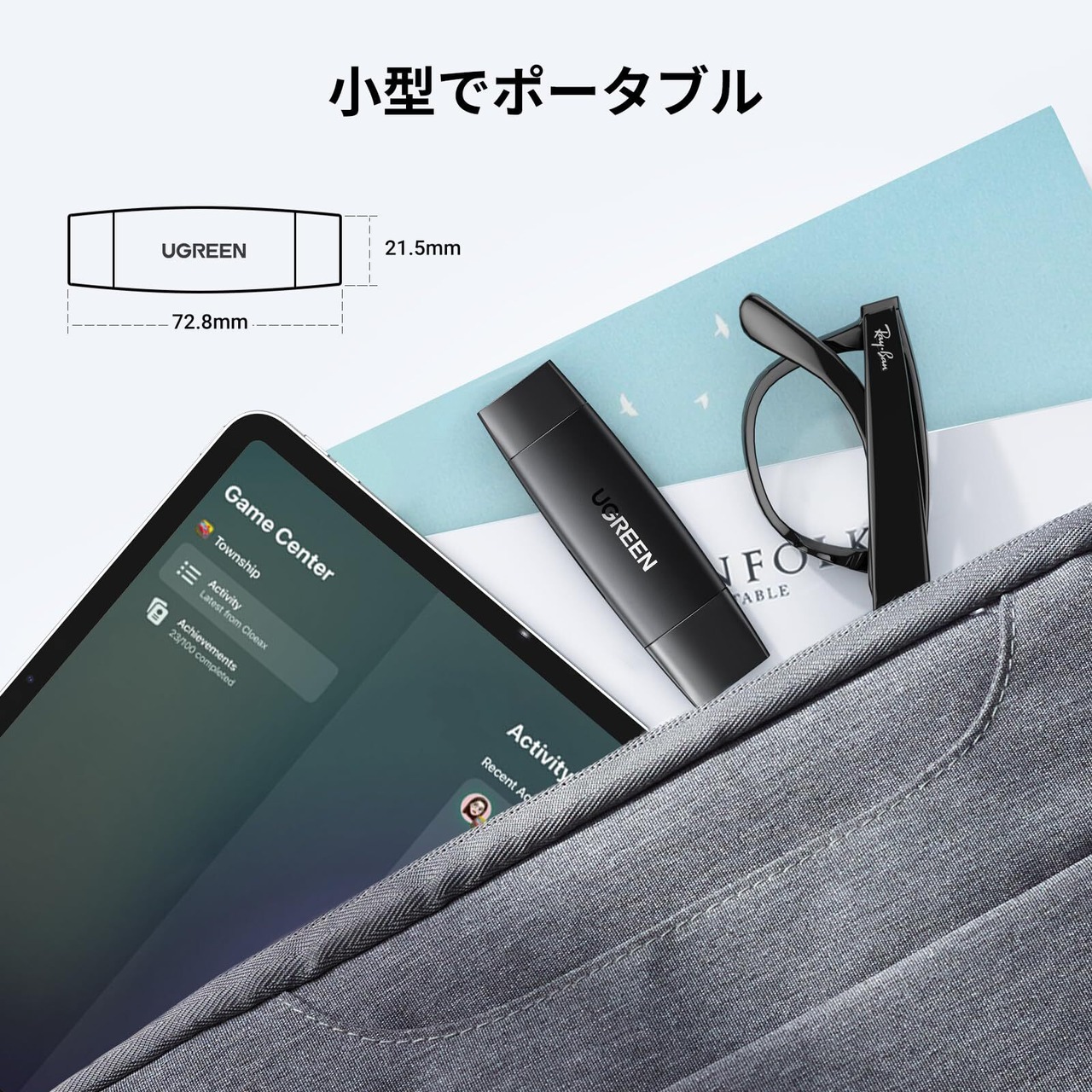 Type-C & USB3.0カードリーダー 1台2役 : UGREEN 2-in-1 SDカードリーダーはUSB-AコネクタとUSB-Cコネクタを搭載し、USB-C OTG機能に対応したAndroidスマホ、タブレット、MacBook、Windows PCに汎用できるUSBカードリーダーです。PS4、Xbox One、iPad Pro 2020/2018、Macbookシリーズ、Dell XPS 15/13、Surface Book 2、Galaxy Tab S6/Galaxy S20などに対応します。