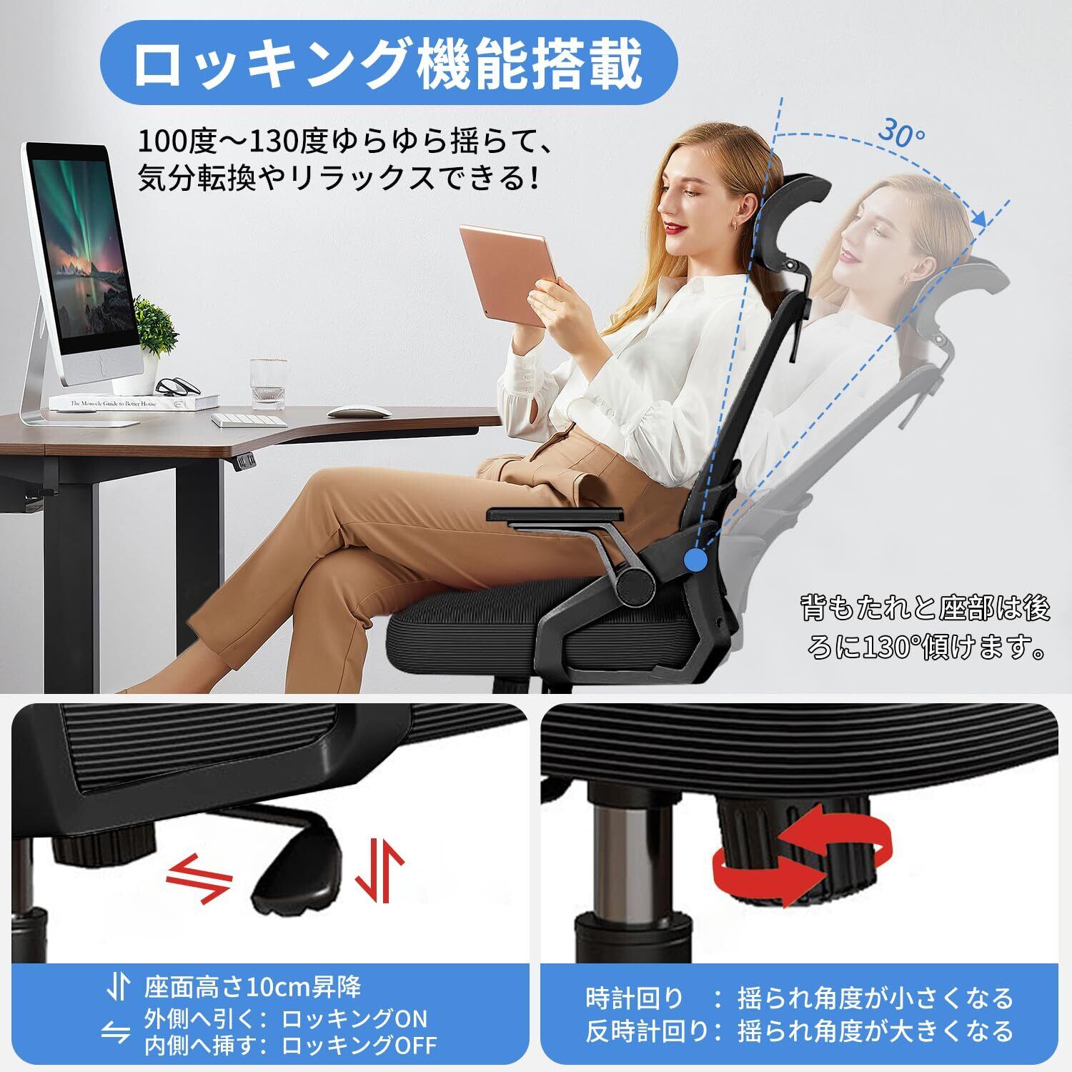 【リラックス背座ロッキング機能が搭載し】: 椅子は30度ロッキング機能を搭載し、座面と背もたれが繋がっていているチェアは座面と背もたれが30度角度で同時に可動します。体を動かすことでゆらゆらと揺れている。長時間の仕事や勉強の合間に、リラックスした時間をお過ごし、ちよっと疲れてしまったとの気分転換ができます。角度調整可能な3Dヘッドレストを搭載し、高さは6 CM、35°角度を調整でき、自分に適する高さや角度を調整して完全に頭部や首を支えることができき、頭と首の圧力を効果的にかんわします。