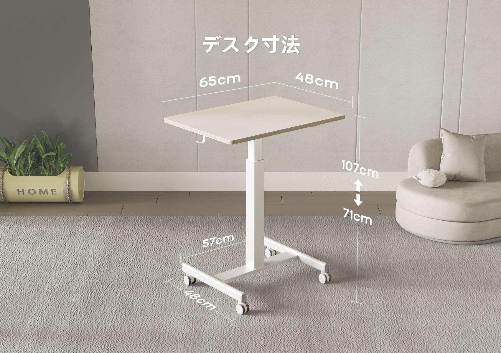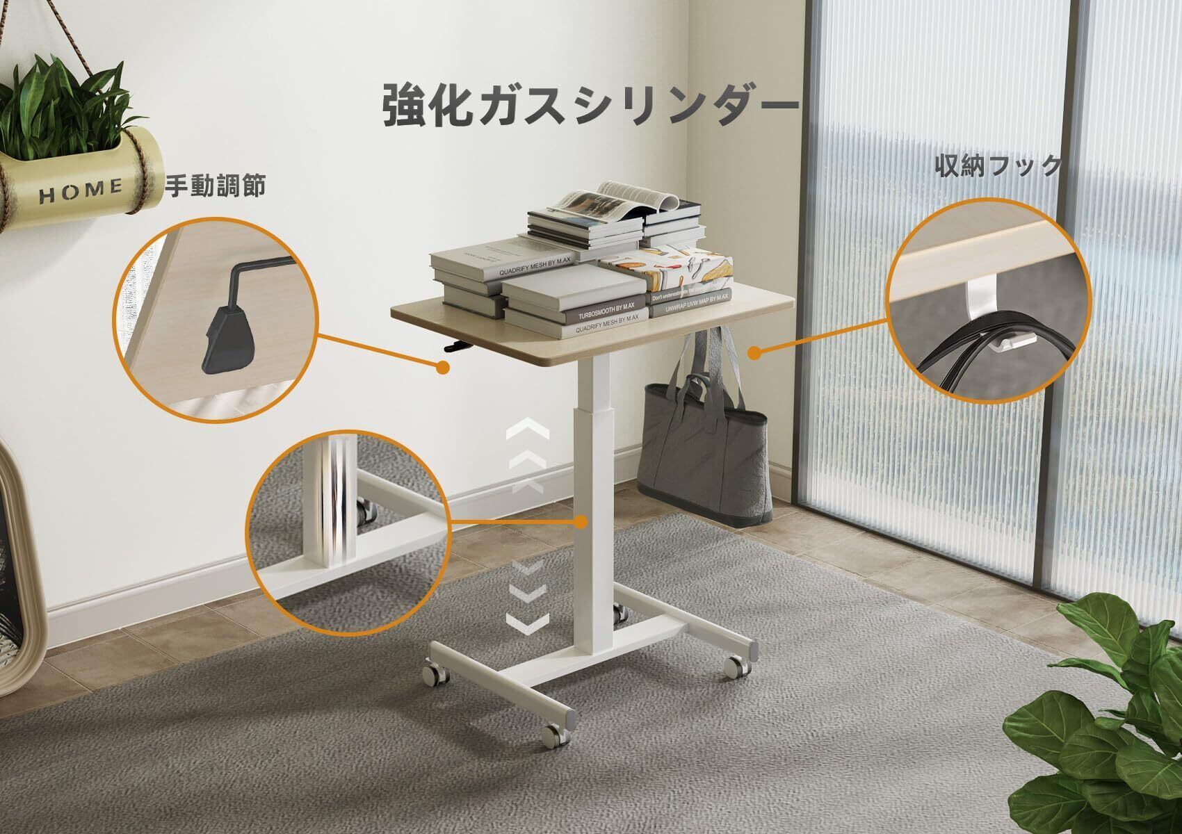 【組立・使用簡単】昇降範囲:70cm~110cm;1人組立て所要時間:5分;使い方も超簡単、ガス圧式なので天板下のレバーを引くだけで簡単に自分の好みの高さに調整できます。キャスター付きなので、サイドテーブルとしてもめちゃ便利です。