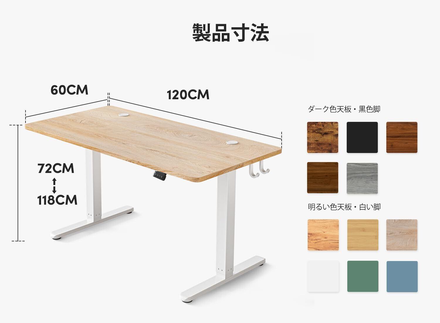 【本体サイズ】*天板サイズ:幅120cmx奥行60cm *昇降範囲:72cm〜118cm(天板とアジャスターを除く) *モニターアーム取り付け可 *お客様組み立て品です