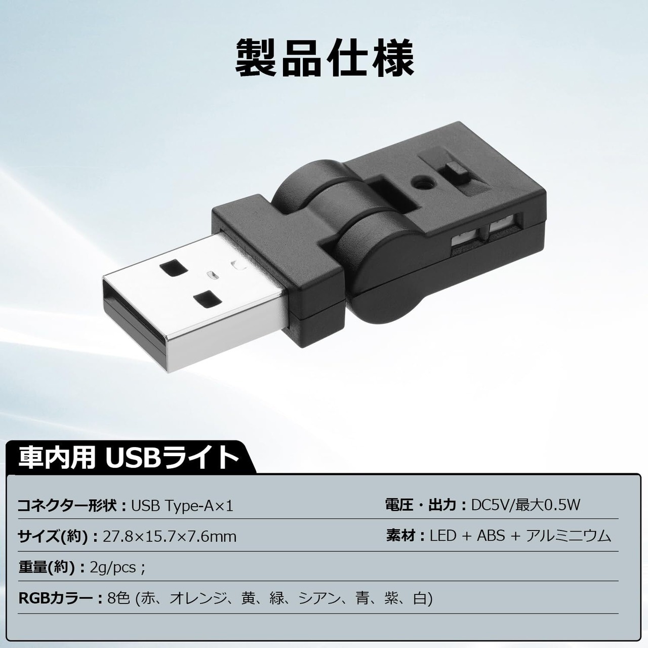 1.【Type-A usbライト】車内にあるType-A USB ポートに接続するだけで、暗くなると自動的に点灯するアンビエントライトです。タイプAポートを持つすべての車両や設備に適用できる広範な用途を備えています。「セット内容」:USB LEDライト Type-A×1p。