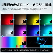 3.【3種類の点灯モード&メモリー機能】①単色・グラデーションモード:ボタンを1回押すと、8色とグラデーションを切り替えます。②ホタルモード:ボタンを2回押すと、ふわっと点灯・消灯を繰り返します。「ホタルモード時にボタンを2回押すと、常時単色点灯に戻ります。」さらに、カラー記憶プログラムを搭載することにより、エンジン再始動後に前回設定カラーで点灯しくれます!面倒な再操作が不要でとても便利!
