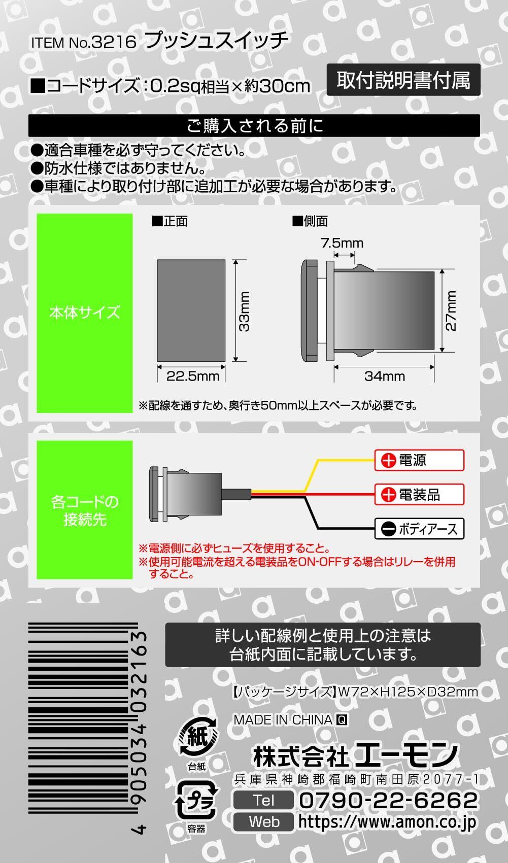 エーモン(amon) プッシュスイッチ(トヨタ車用) ON-OFF DC12V・500mA 発光色:ホワイト 3216