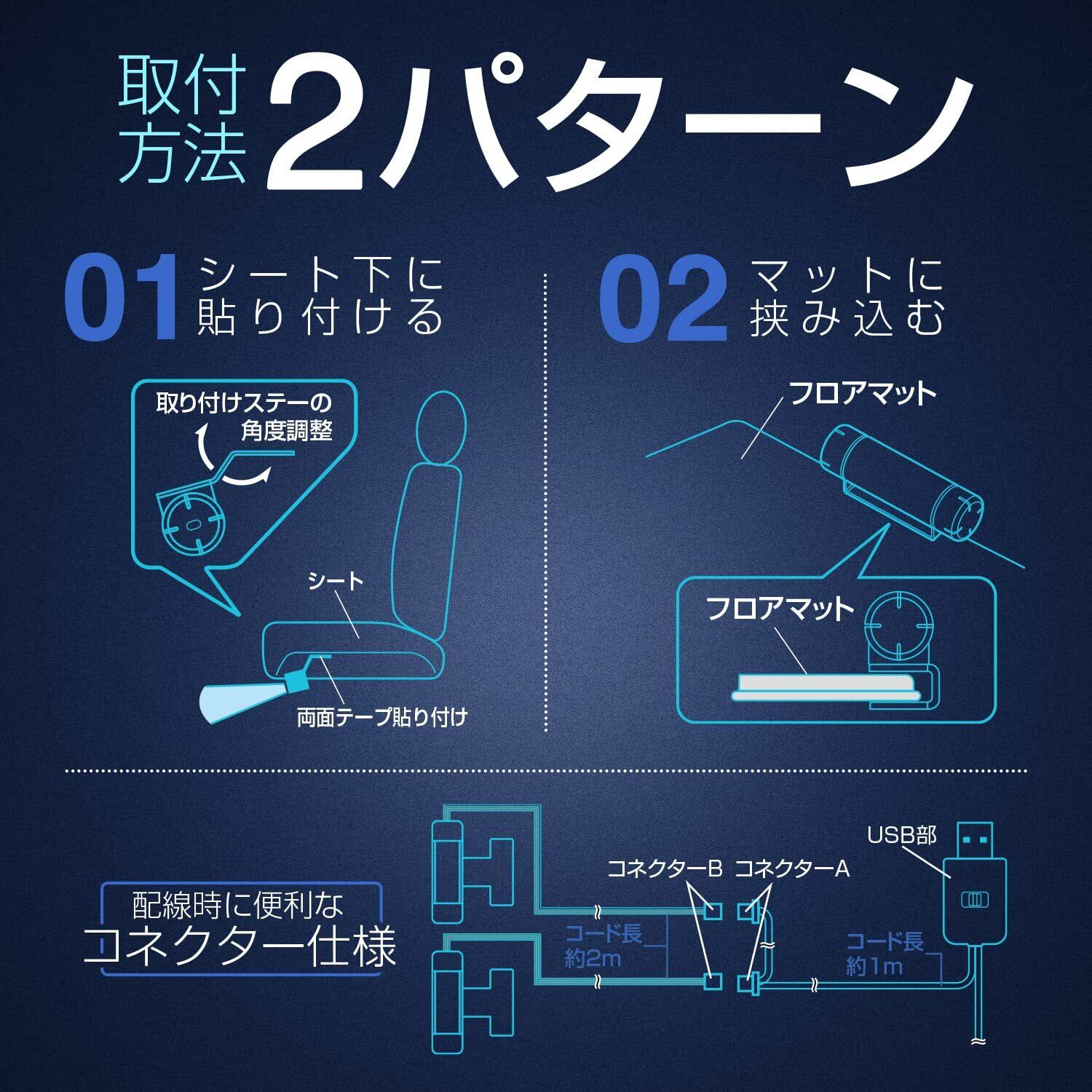 ライトユニットは取り付けステーを使用して、両面テープでシート下に貼り付けたり、フロアマットに取り付けてフロア(足元)を照らします。
