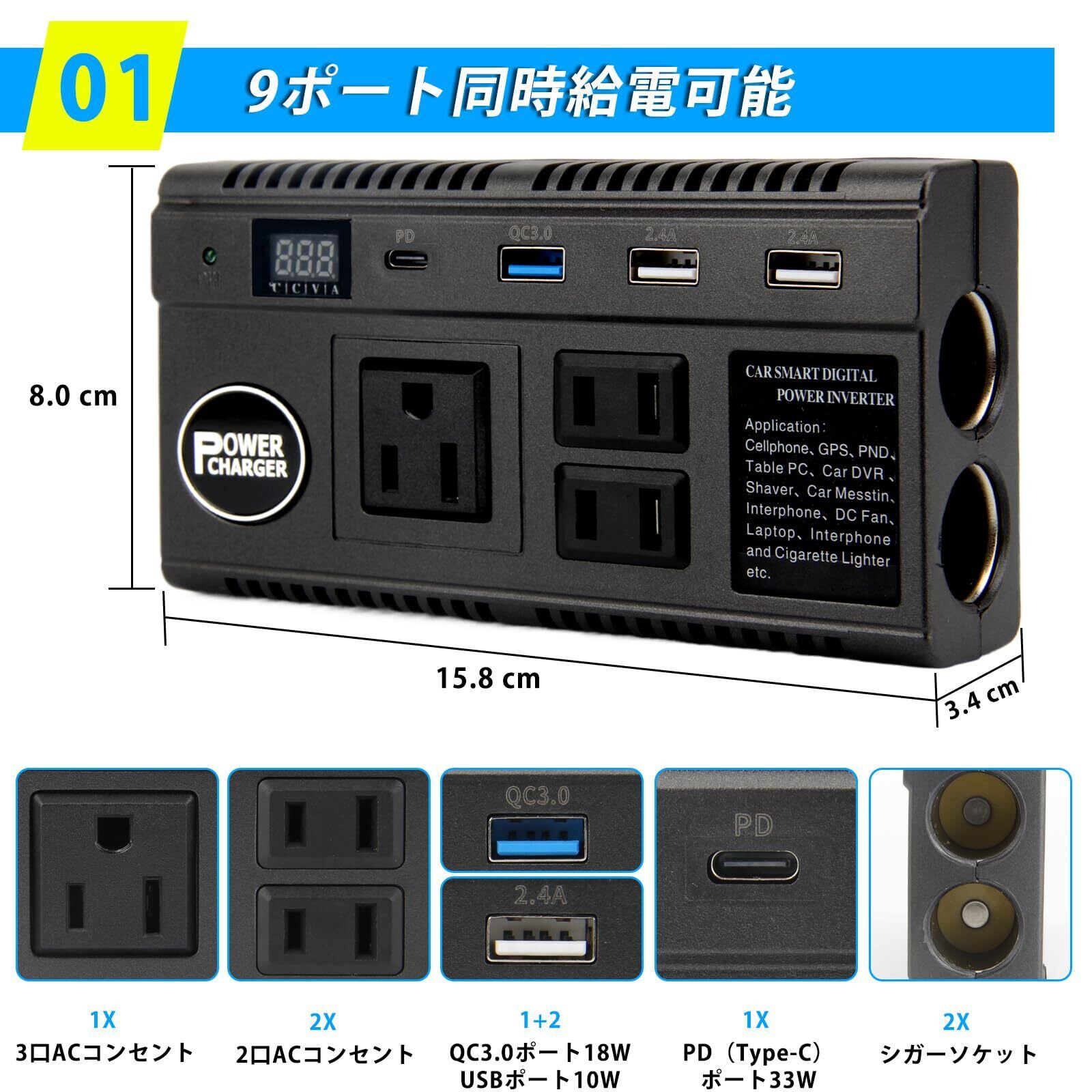 【新登場モデルPDポート追加!】自動車のバッテリーのDC12V/24V直流電力をAC110V交流電力に変換して、定格120Wのパワー供給、DC12V/24Vどちらも使用可能のカーインバーターです。12V車/24Vトラックに対応可能。給電口九つ:USB給電口×3、3口ACコンセント×1、2口ACコンセント×2、シガーライターソケット×2、PDポートx1。スマホ、タブレット、電子書籍リーダー、ノートパソコンなどを同時に充電できますので、大切な電子機器の電池切れの心配がないドライブを楽しめます。ON/OFFスイッチを搭載しているので省エネに使用できます、シガーソケットに差したまま電源を切ることも出来ます。ONの時点灯する電源指示ランプも付いているので分かりやすいです。ご注意:本製品は修正弦波なので、テレビ、プリンターなど精密機器は使えません。また、12V車のシガーソケットに接続してご使用の際に、100v以上の家電製品の作動は不安定になる場合もあります。100v以下の家電製品(パソコン、携帯、カメラ、受話器、レーザー、小型ファンなど)使ってください。