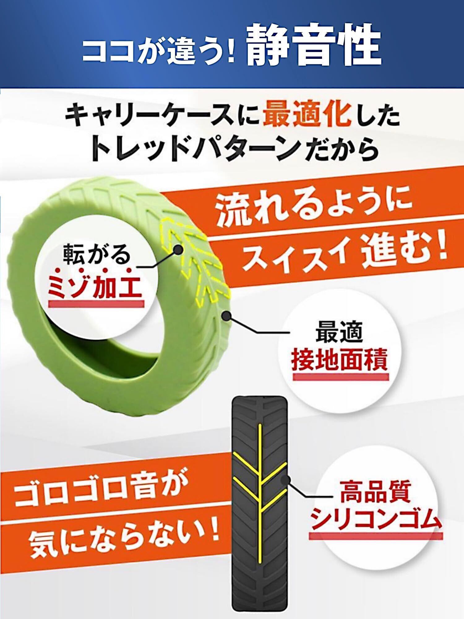 1. ぴったりサイズでキャスターを保護し寿命延長 キャスターをしっかり保護し、摩耗や損傷を防ぎます。その結果、スーツケース全体の寿命が延び、長く快適に使えます。 2. 衝撃吸収と騒音軽減 柔軟性と弾力性のある高品質なシリコン素材を採用し、キャスターが受ける衝撃を効果的に吸収します。さらに、独自の波模様デザインにより、キャスターから発生する騒音を軽減します。これにより、静かな移動を実現し、旅行中のストレスを軽減します。また、絡まりやすい髪やゴミを防止する設計で、衛生的かつ快適に使用できます。 3. 脱落防止と多面的な保護 広いカバー面積により、キャスター全体を包み込むデザインを採用。カバーがしっかりと固定されるため、移動中に外れる心配がありません。また、ほこりや土などの汚れがキャスター内部に入り込むのを防ぎます。さらに、キャスターが傷つくのを防ぎ、美しい状態を長期間維持することができます。 4. 簡単装着・お手入れ可能 伸縮性に優れた素材で、キャスターを外さず簡単に装着でき、誰でも数秒で取り付け可能です。使用後は水洗いして陰干しするだけで清潔さを保てます。特に、キャスターカバーを使用することで汚れた車輪を室内に持ち込むことがなくなり、快適な使用環境を実現します。お子様でも簡単に扱えるので、家族全員で安心して利用できます。 5. 適用範囲と注意事項 本製品はダブルホイール型キャスター専用で、シングルホイールには対応していません。さらに、車輪のサイズ(直径と厚み)やフェンダーとの間隔が適合しているか、購入前に必ず確認が必要です。正しく装着することで、キャスターがスムーズに回転し、快適に移動できます。カバーがしっかり固定されていることを確認し、安全かつ最適な効果を発揮してください