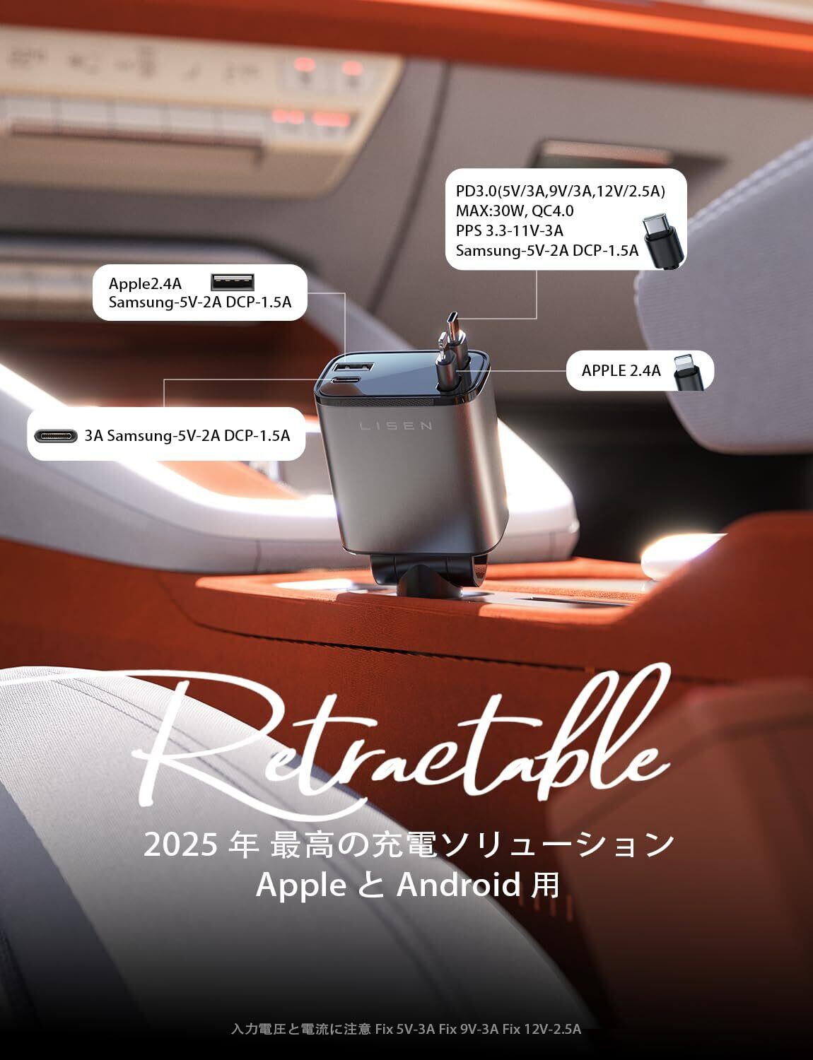 【コンパクト・高性能】リスンの 4 in 1 シガーソケット 巻き取り式車載充電器はコンパクトでパワフルです。サイズは約 5.57cm×3.39cm×13.6cm で、車のインテリアに完璧に調和します。160° 回転が可能で、幅 2.2cm、最大挿入深さ5.46cm のシガーソケットに対応します。車用充電器の巻き取り式充電ケーブルは、80cm まで伸ばすことが可能です。トラックや車のアクセサリーやセミトレーラーの狭い場所などに最適で、コンパクトなデザインはスペースを節約します。シガーソケット周辺のスペース、特にカップホルダーに近い場所では十分なスペースを確保して、最適な設置効果を得るようにしてください。