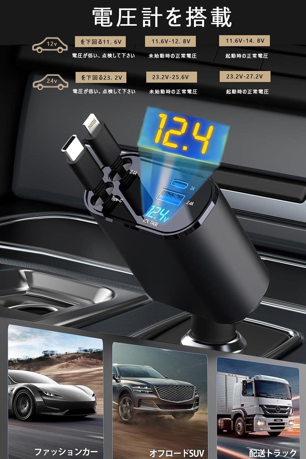 Beautytrees 車 シガーソケット 充電器 USB 巻き取り式ケーブル2本 4台同時に充電 Type-C100W Lightning20W急速 カーチャージャー 車載充電器 対応iphone16/iPhone 15/14/13/12, Galaxy S22/S21 Ultra, iPadなど LED付オー電圧測定 DC12/24V車対応