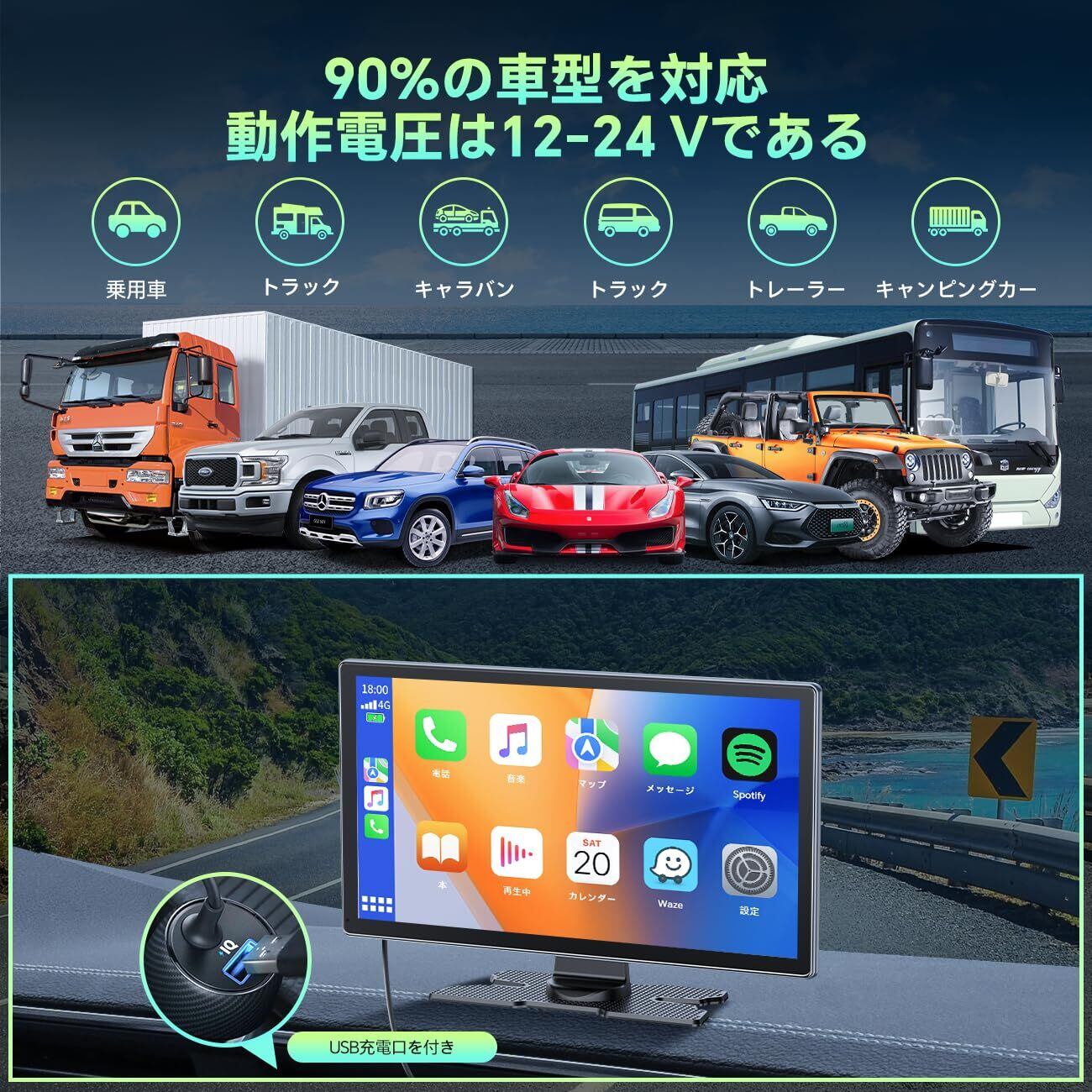 【音声コントロール&1080P駐車補助リアカメラ】スマホを接続した後、SiriまたはGoogleアシスタントをウェイクアップできるようになります。日本語で音声コントロールできます。スマホ リアルタイム地図より、地図更新が必要なくて、地図ルート情報、周辺の建物、ショップ、渋滞を見ることができます。旅はより安全と楽しみにしてください。付属のリアカメラを取り付けることで、バックギア連動のバックカメラ機能を使うことが出来ます。9インチの大画面で後ろを確認しながらバックが出来て安全をアシスト。乗用車だけでなく24Vにも対応しているので大型車にもご利用いただけます。