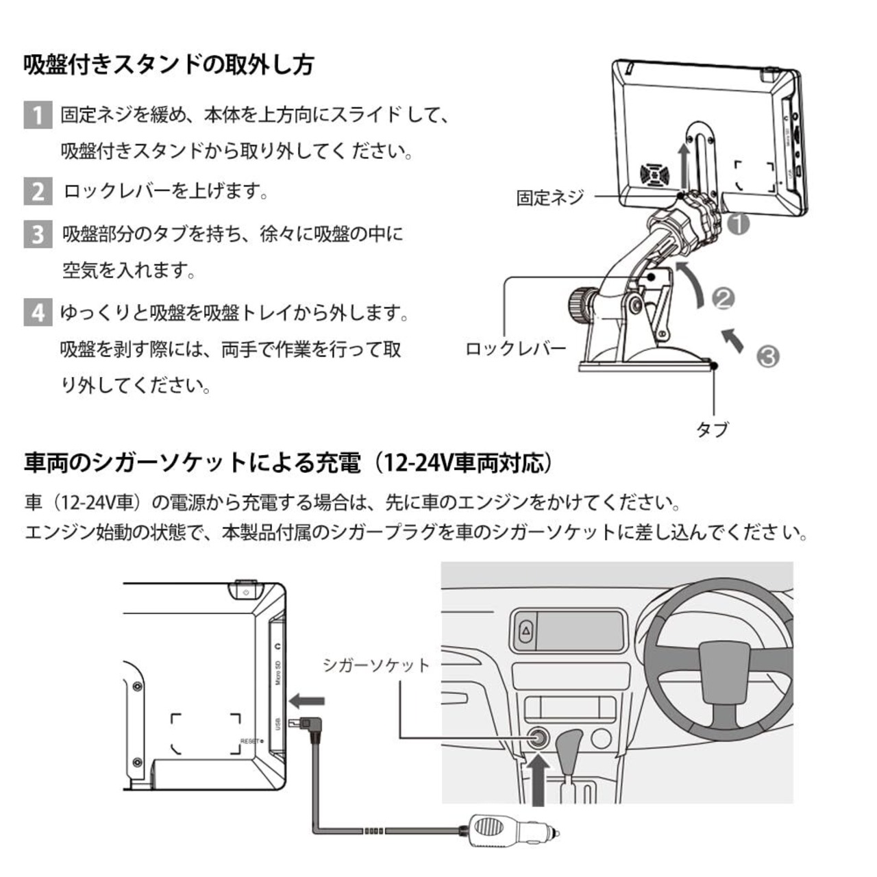 付属コンポーネント 3M両面テープ付き吸盤トレイ, シガー電源アダプター, 取り付けステー(吸盤式), 【日本語取説(本体&ナビ)】
