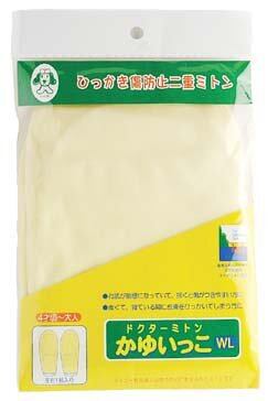 「ドクターミトンかゆいっこWL」は、天然系抗菌防臭素材クラビオンを使用した、アトピー肌対応のひっかき防止のすべる二重ミトンです。 ミトンを着けて皮膚を搔こうとすると、内側のミトンがから滑りし、ひっかき傷がつきにくくなっています。内側ミトンにはお肌にやさいい天然系抗菌防臭素材クラビオン、外側にはすべりのよい天然系素材キュプラを使用しています。 内側ミトンにゴムが付いていますが手の甲のみでお肌への刺激がより少なくなっています 。4歳頃~大人までお使いいただけます。 左右1組入り。