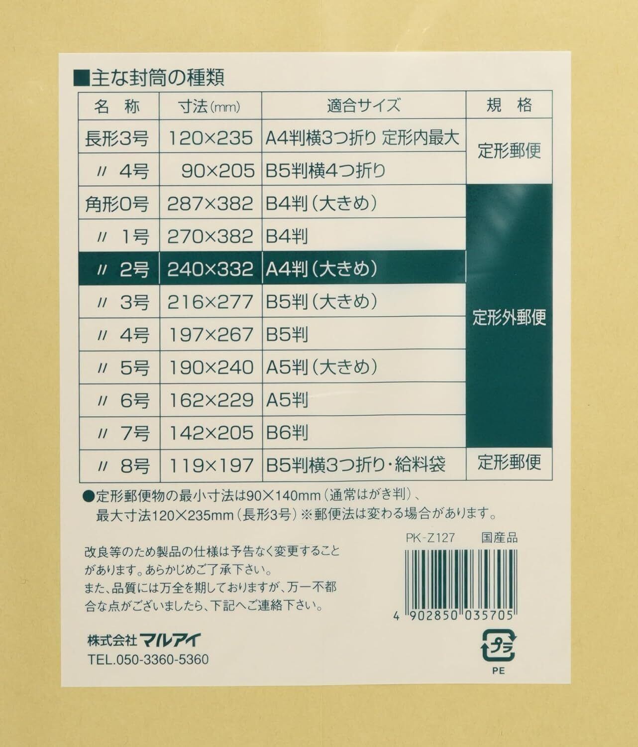 サイズ:角形2号(240mm×332mm)/定型外郵便