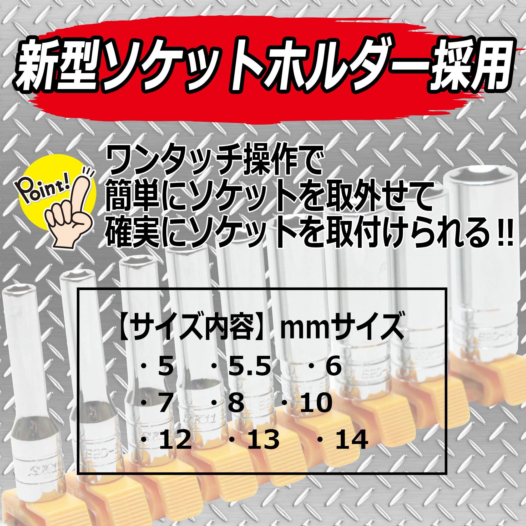 特徴:差込角6.35mmミリサイズ対応、ディープソケット9個組セット