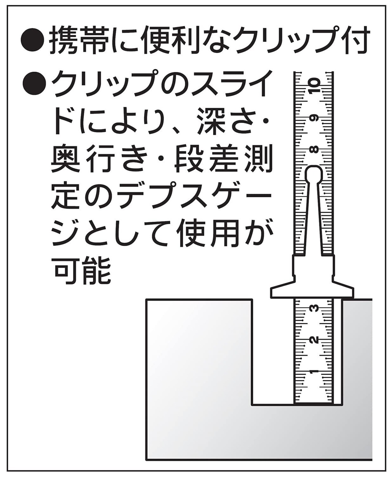 ・携帯に便利なクリップ付きで、クリップのスライドにより深さ測定、段差測定のデプスゲージとして使用が可能