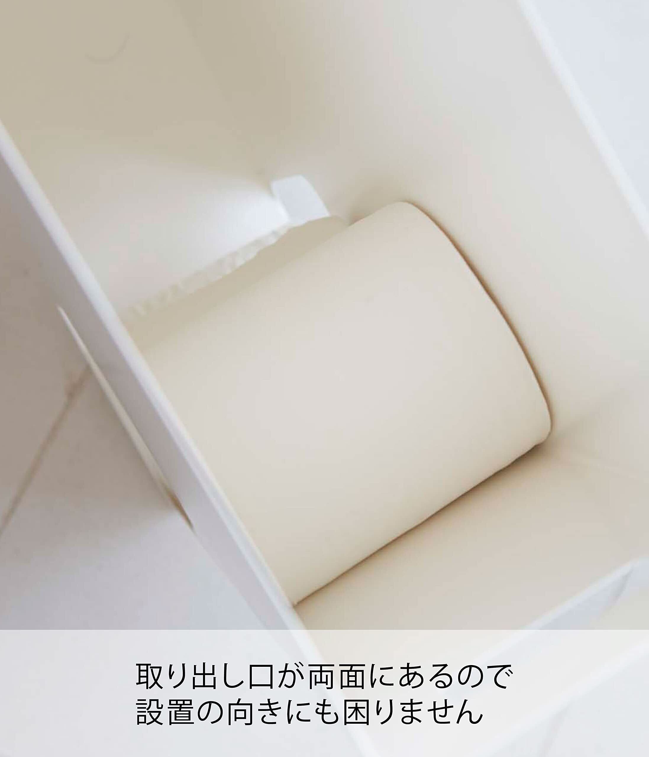 ●トイレットペーパー12ロールを美しく隠してスリムに収納。1ロール取り出すと次のロールが出てくる便利な構造。コーナーに置けば存在を主張せず、空間に美しくなじみる。 取り出し口が両面に貫通しているので設置の向きに困ることもない。トイレットペーパー12ロールをまるごと収納できる。取っ手穴が付いているので移動や掃除もラクラク。1個取り出すと次のロールがスタンバイ!