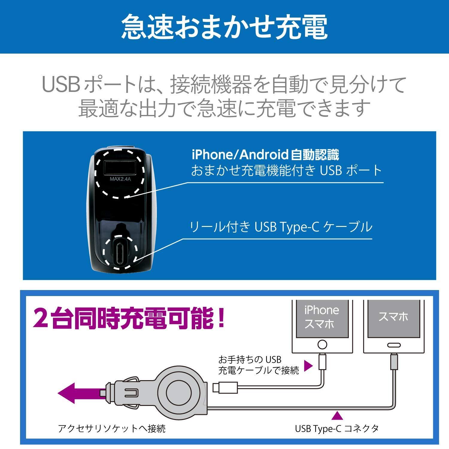 USB Type-Cコネクタに対応。 巻取り式のUSB Type-Cコネクタと、おまかせ充電に対応したUSBポートを搭載し、合計最大出力5.4Aの高出力でスマートフォンやタブレット2台を同時に充電できる車載充電器。