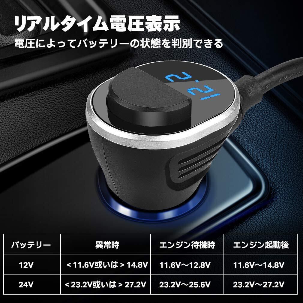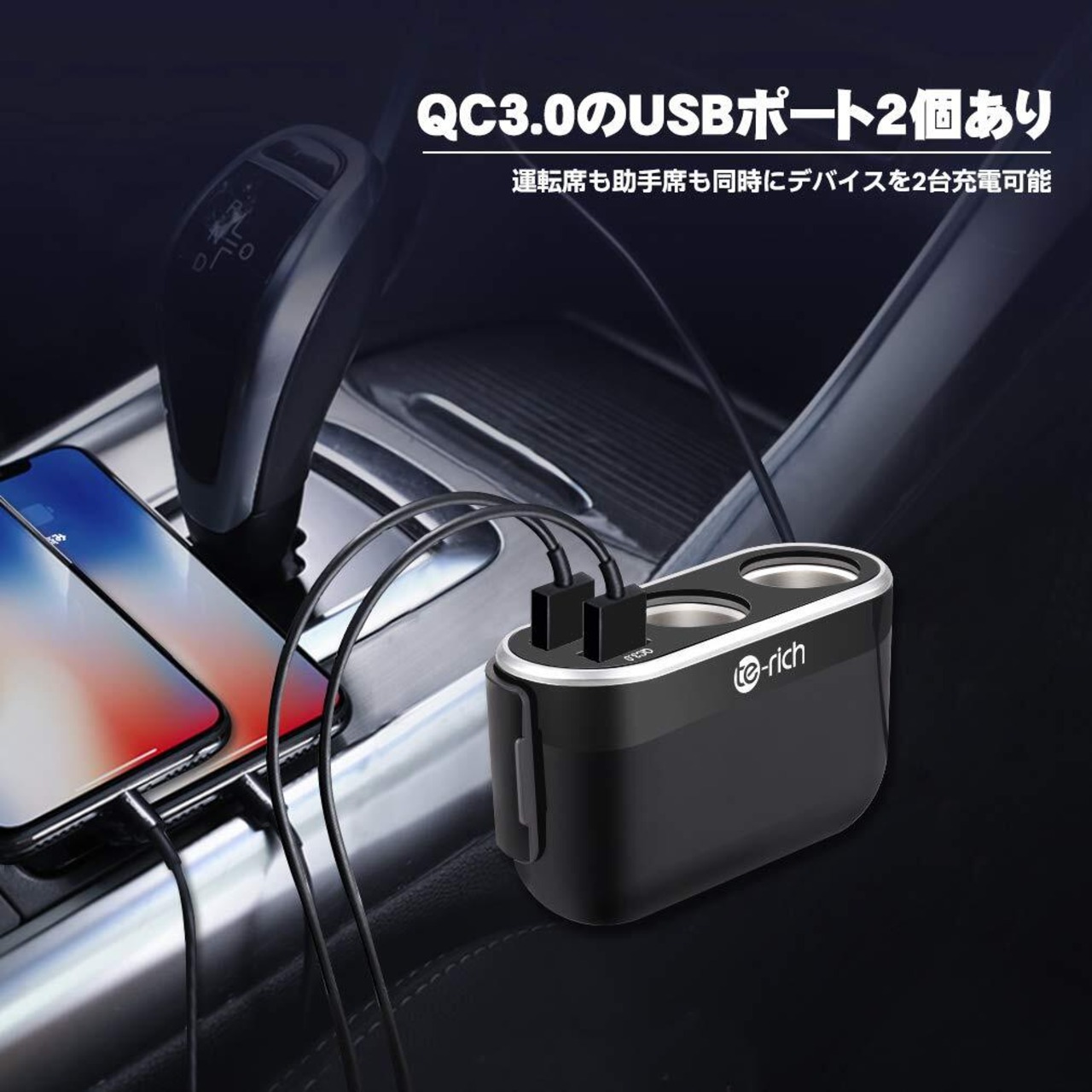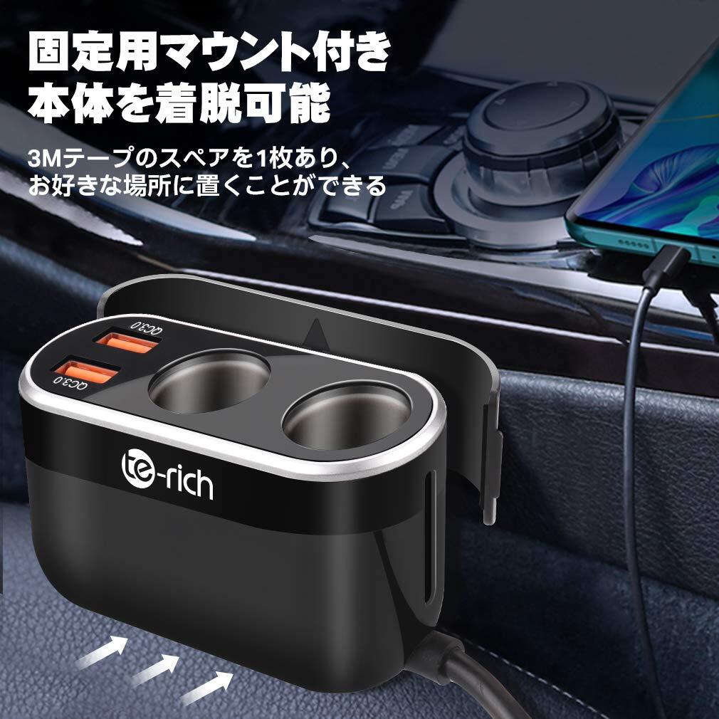 Te-Rich シガーソケット 2連 usb車載充電器 QC3.0急速充電 2USBポート 最大96W 12V/24V車対応 電圧測定 LED付き 過負荷保護 着脱可能 (ブラック) iPhone 6s Plus対応