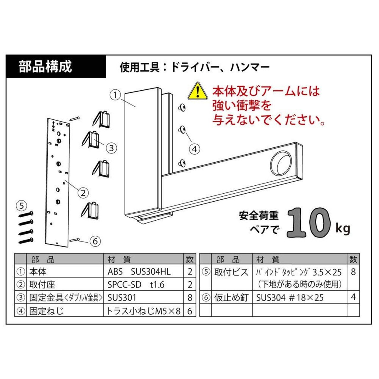 安全荷重:10kg(2個使用) ブラケット(2個入)のみの商品。物干し竿、ハンガー等は付属しておりません。