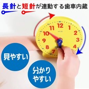 学校の授業などで使われることを想定したこの学習時計は、大きな文字盤で見やすく、長針を動かすと短針も連動して動く歯車内蔵。