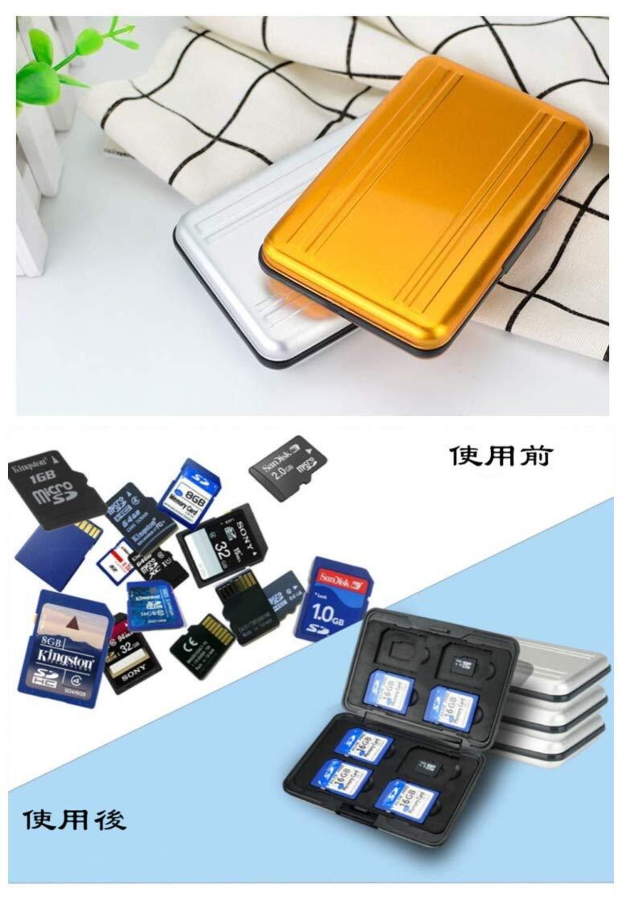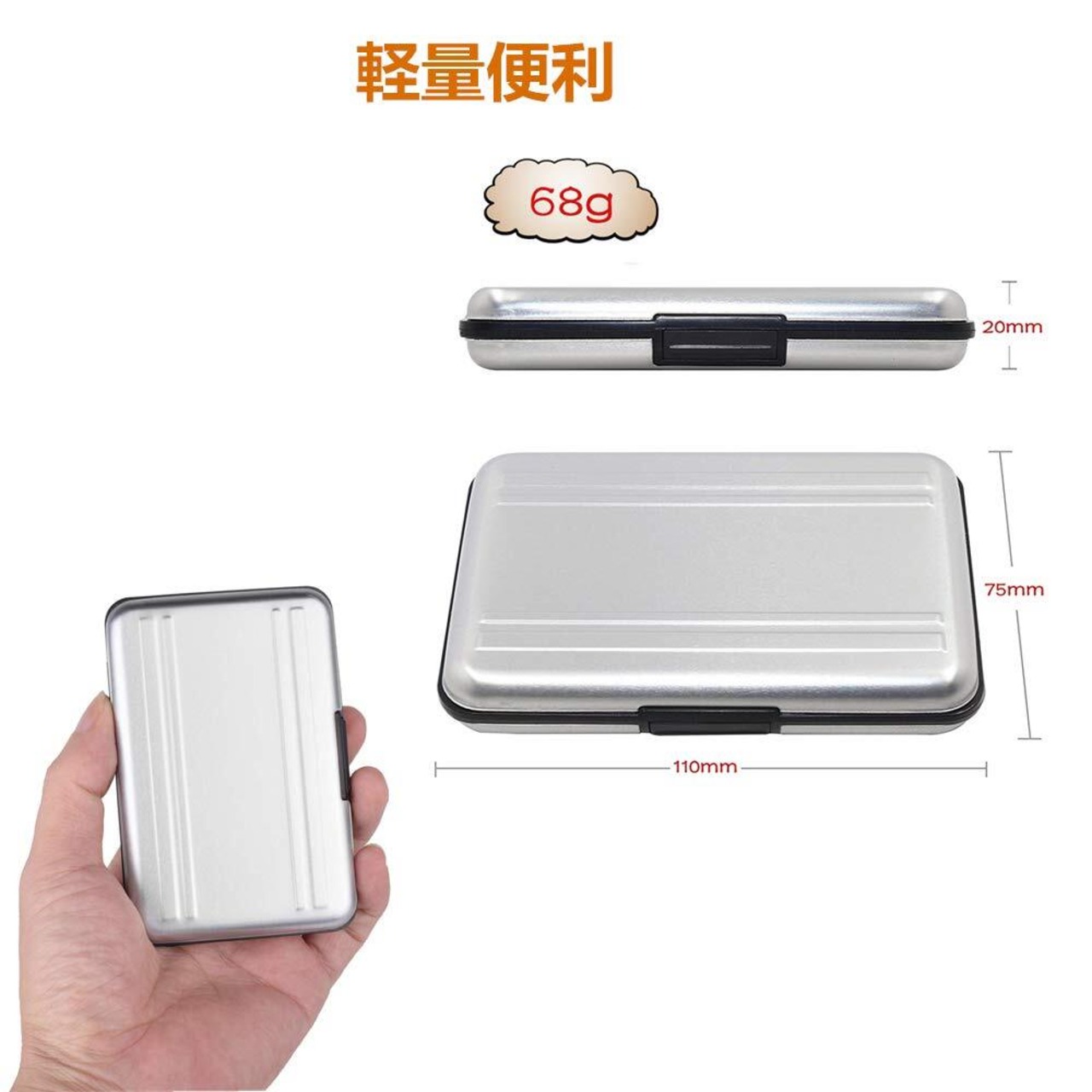 【材質】アルミ(ケース部分)、EVA(トレー部分)。丈夫でスタイリッシュなアルミ製のマイクロSDカード収納、メモリーカードをしっかり守って、防水、防塵機能も強いです。