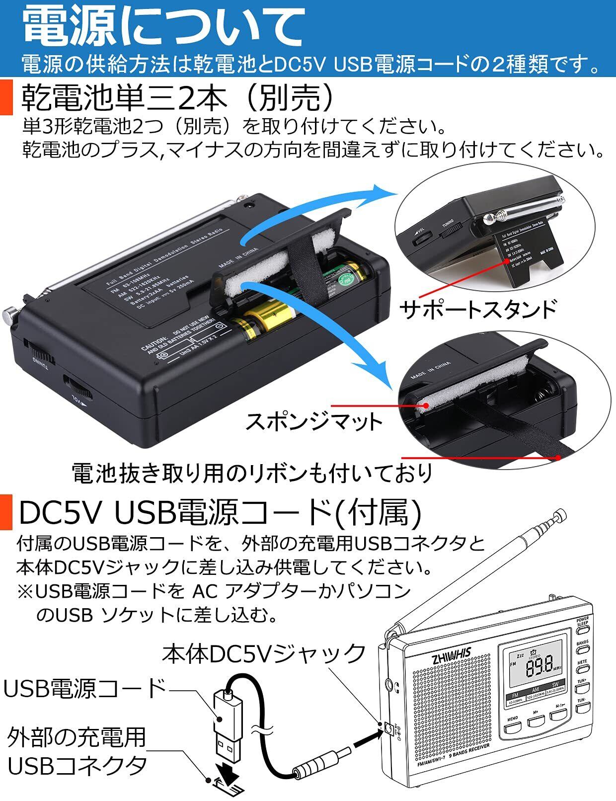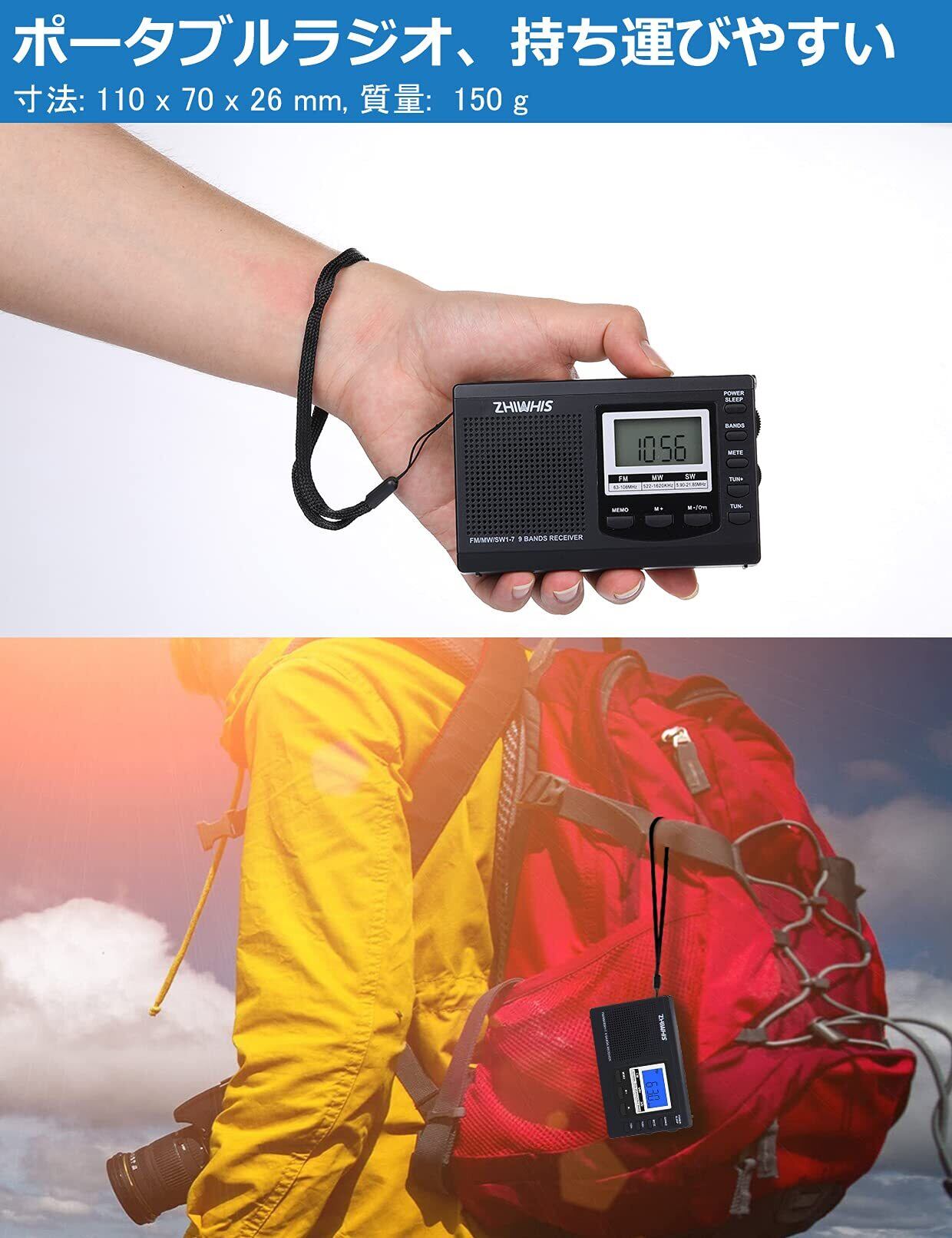 ZHIWHIS ラジオ 小型ポータブル FM/AM/SW ワイドfm対応 クロック防災ラジオ 電池式 タイマー/目覚まし時計/デジタル時計/キーロック/プリセット機能付き 横置き型 携帯 学習 災害用 日本語取説&書付き