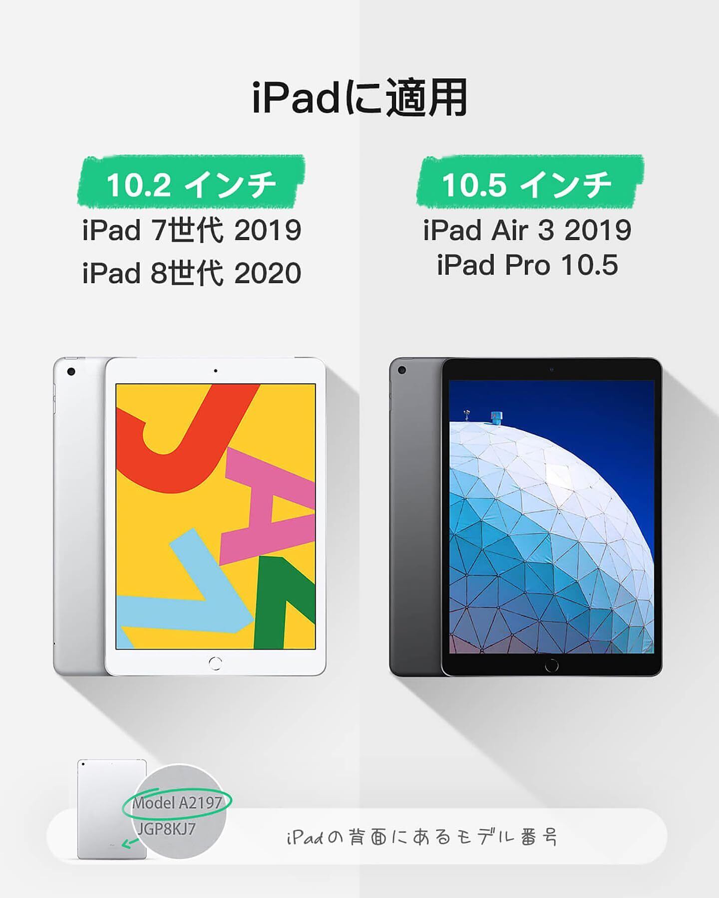 対応機種:iPad 第9世代/第8世代/第7世代(10.2インチ)、iPad Air 第3世代(2019年リリーズ)、iPad Pro 10.5インチを含めて、すべての10.5インチと 10.2インチiPadに適用します。注意:本製品は2022年10.9インチiPad第10世代に対応していません