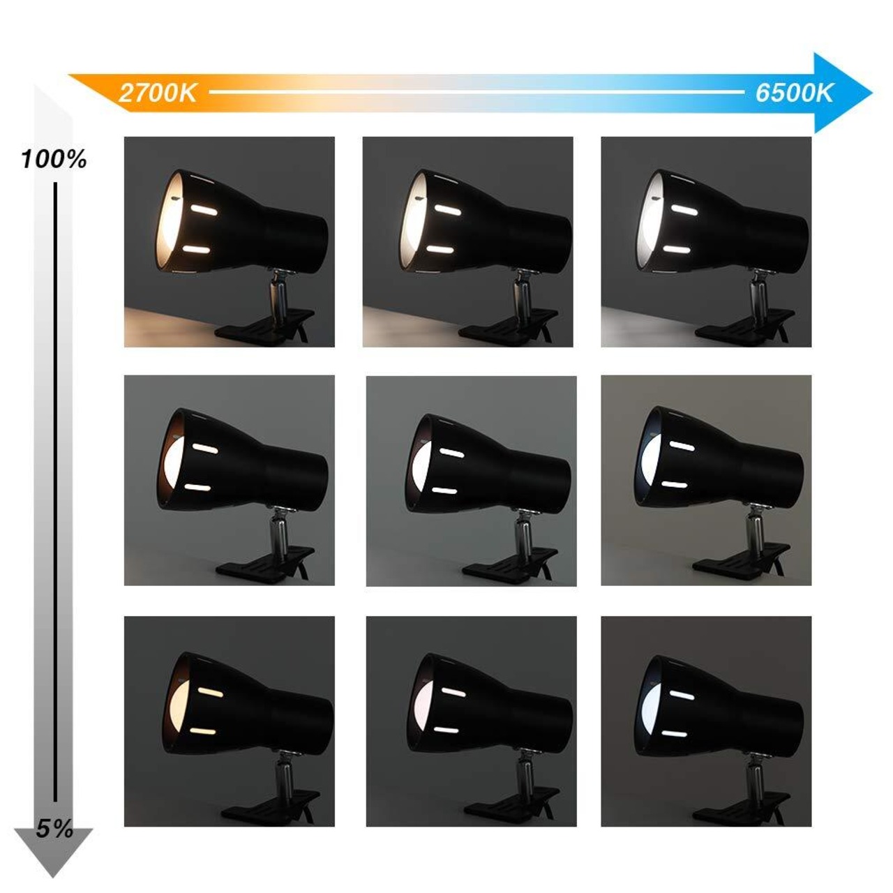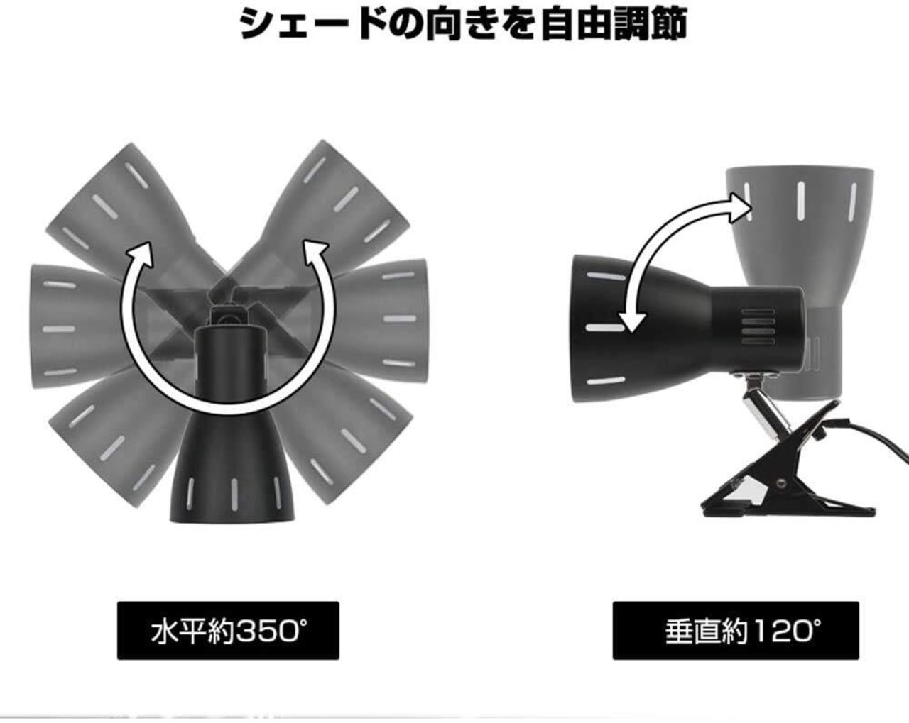 照射角度自由:シェードは350°回転、左右120°動けるので光の向きが自由に調節できます。クリップと合わせて利用すれば、実用性がさらに広がります。