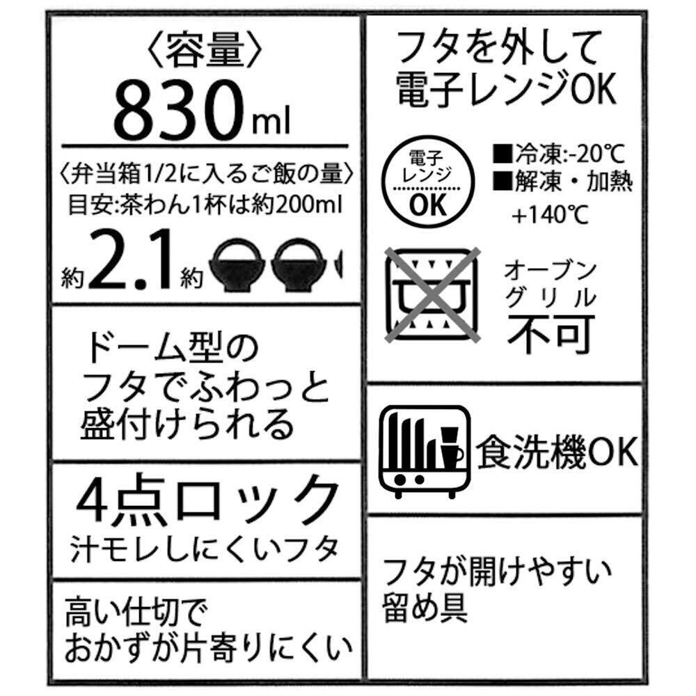 ○ドーム型のフタでふわっと盛っておいしさUP! 製品サイズ(約) : 横224×縦128×高63mm 製品重量(約) : 40g 容量 : 830ml フタ : AS樹脂 本体・止具・仕切 : ポリプロピレン パッキン : シリコーン 使用抗菌剤の種類 : 無機抗菌剤 フタ : 耐熱温度100度 本体・止具・仕切・パッキン : 耐熱温度140度 生産国 : 日本