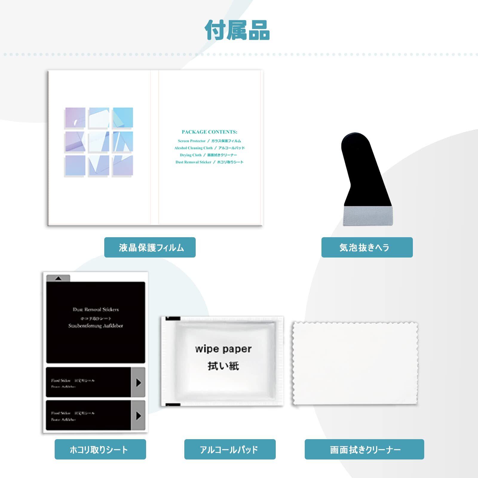 【内容品】レヴォーグ vn 保護フィルム*2、ウェットティッシュ*2、 除塵ステッカー*2、清潔布*2、気泡抜きヘラ*1。レヴォーグ液晶フィルム