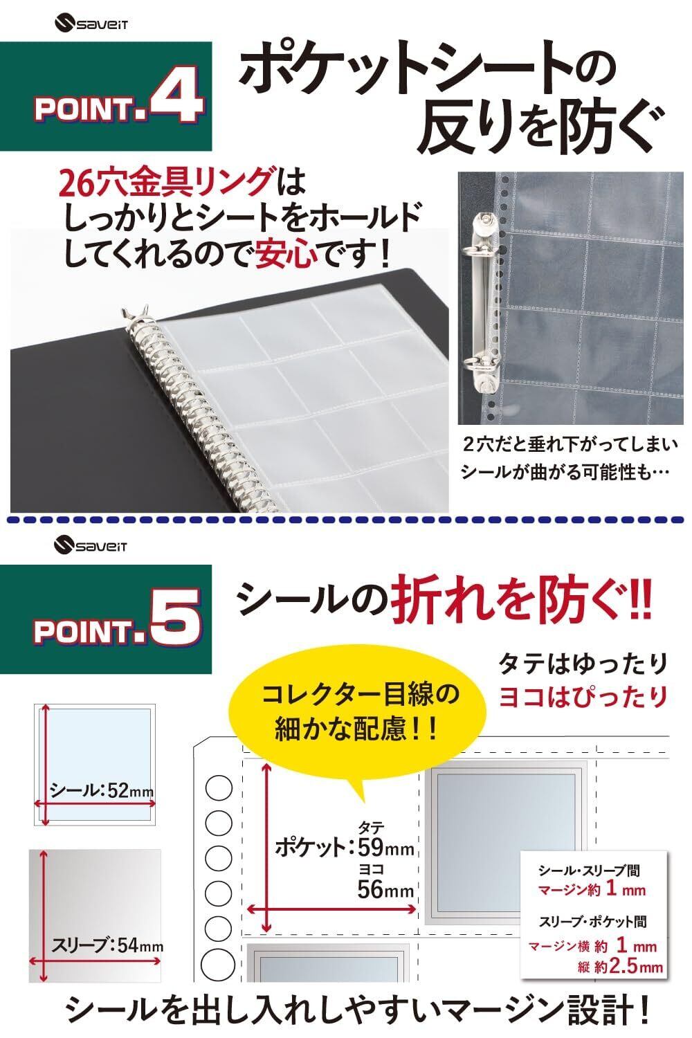 【シールの反りを防ぐ!】 ポケットシートとシールスリーブでダブルカバーし保護されるため、シールの反りを防ぎます。また、ポケットシートとシールスリーブ共に厚みがあるビニールを採用しているのでシールの反りをより防ぐ効果が期待されます。 【ポケットシートの反りを防ぐ!】 バインダーにも厚みのあるPP素材を採用。26穴金具は、しっかりとシートをホールドしてくれるのでシート自体の反りを防ぎます。2穴金具は、シートが垂れ下がりシールが曲がってしまう可能性があります。