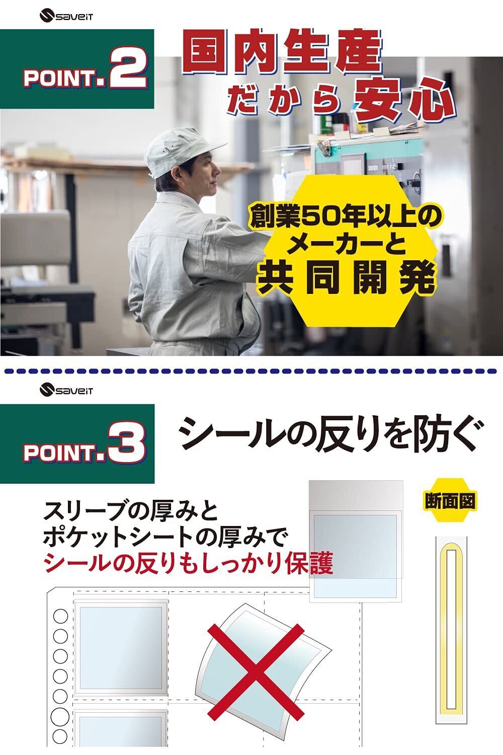 【汚れやホコリをシャットアウト!】 商品画像のようにシールスリーブを上からシールにかぶせて、その後ポケットシートに挿入していきます。ポケットシートとシールスリーブのダブル使用で汚れやホコリなどの360度全方向の侵入から大切なシールをしっかり保護・保存します。 【国内生産だから安心!】 当商品に使われている12ポケットシート・シールスリーブすべて、日本国内で生産しています。すべてのメーカーともに創業50年を超えており経験豊富で各分野で実績多数の国内メーカーです。国内メーカーだから「安心・安全・高品質」「供給も安定している」「不具合に迅速に対応可能」など数々のメリットがあります。 生産工場と様々な面で距離が近いことにより、コレクターの皆様の声を反映し、改善を重ねていきやすい環境が整いました。