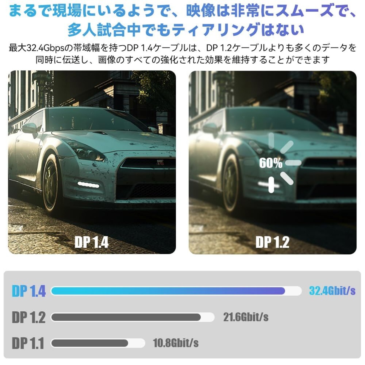 Displayport ケーブル 1.4は、高純度の無酸素銅コアを使用し、最大8K @ 60HZの解像度をサポートし、displayport ケーブルは4K @ 120HZとも互換性があります。dp 1.4ケーブルは、最大240Hzの解像度をサポートし、動的HDR / DSC / FECをサポートし、32.4Cbpsの帯域幅伝送をサポートします。高音質と高精細画質の2層の組み合わせを実現し、動画再生・送信時の視聴を存分に楽しむことができます。ゲームでは、リフレッシュレートが高いということは、1秒あたりの出力フレームレートが高いことも意味します。これにより、ゲーム画面がスムーズになり、スタックしなくなります。