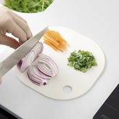 使いがっての良いミニサイズのまな板に機能をたくさん詰め込みました。くるくる回しながら違う具材をカットできる丸いまな板と、フライパンやお鍋に移し易い角がある四角いまな板の良いとこ取りの形状。