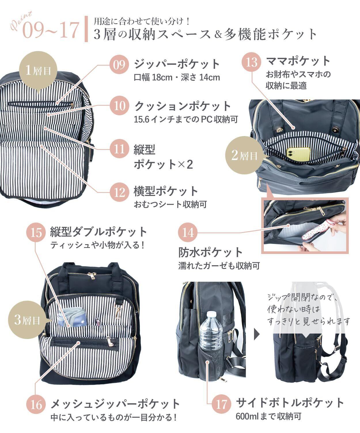 [アンコール] マザーズリュック 【頑張るママを応援する20の工夫】 マザーズバッグ 『収納のプロ監修』 多機能 上質ナイロン 3層式 国内ブランド リュック バックパック レディース A4 大容量 PC収納