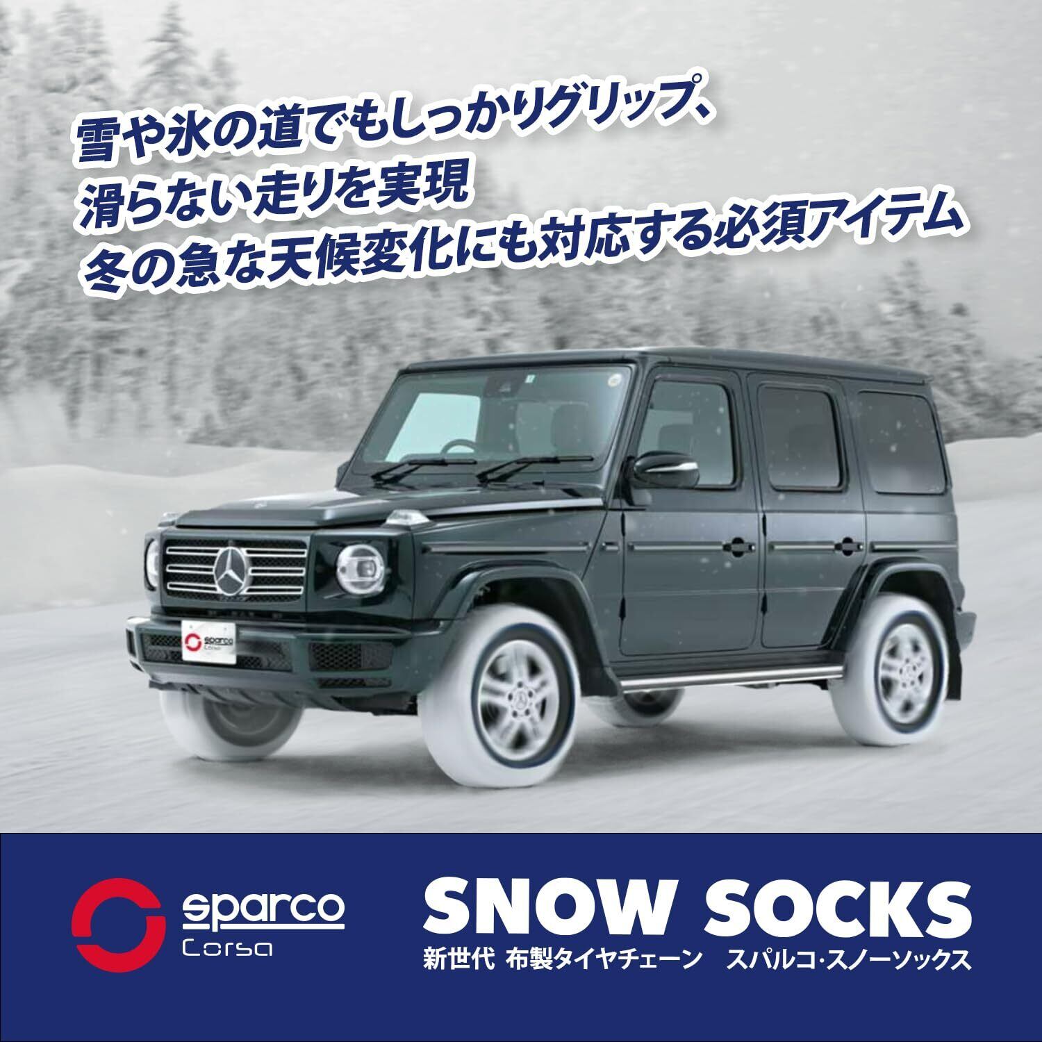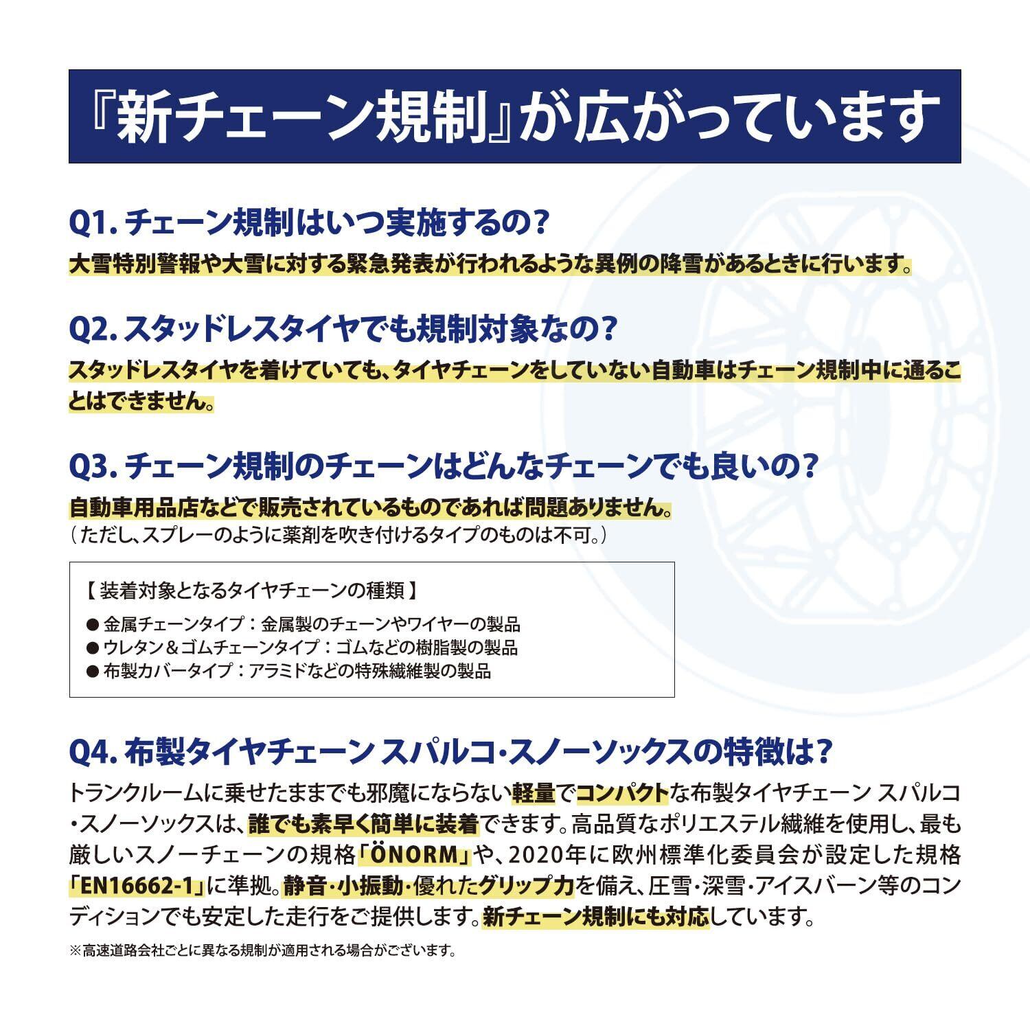 新チェーン規制対応品です。チェーン規制対象路線では、大雪の時にはスタッドレスタイヤであってもチェーンの装着が義務付けられました。全国的に導入エリアが拡大しています。「スパルコ・スノーソックス」の高品質ポリエステル繊維は最も厳しいスノーチェーンの規格「ÖNORM」を取得しています。高いグリップ力で日本の雪路においても、圧雪、深雪、アイスバーンなどのコンディションにおいて安定した走行を提供いたします。