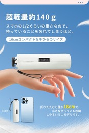 【140g驚くほど軽量】「超軽量」「超コンパクト」「実用性」を兼ね備えた折りたたみ傘が仕上がりました。折りたたむとスマホのように長さ16cmになりますが、重さはわずか140g。約スマホの半分の重さでカバンに入れて常備しても負担になりません。持っていることを忘れるくらい、軽くて持ち運びに便利です。