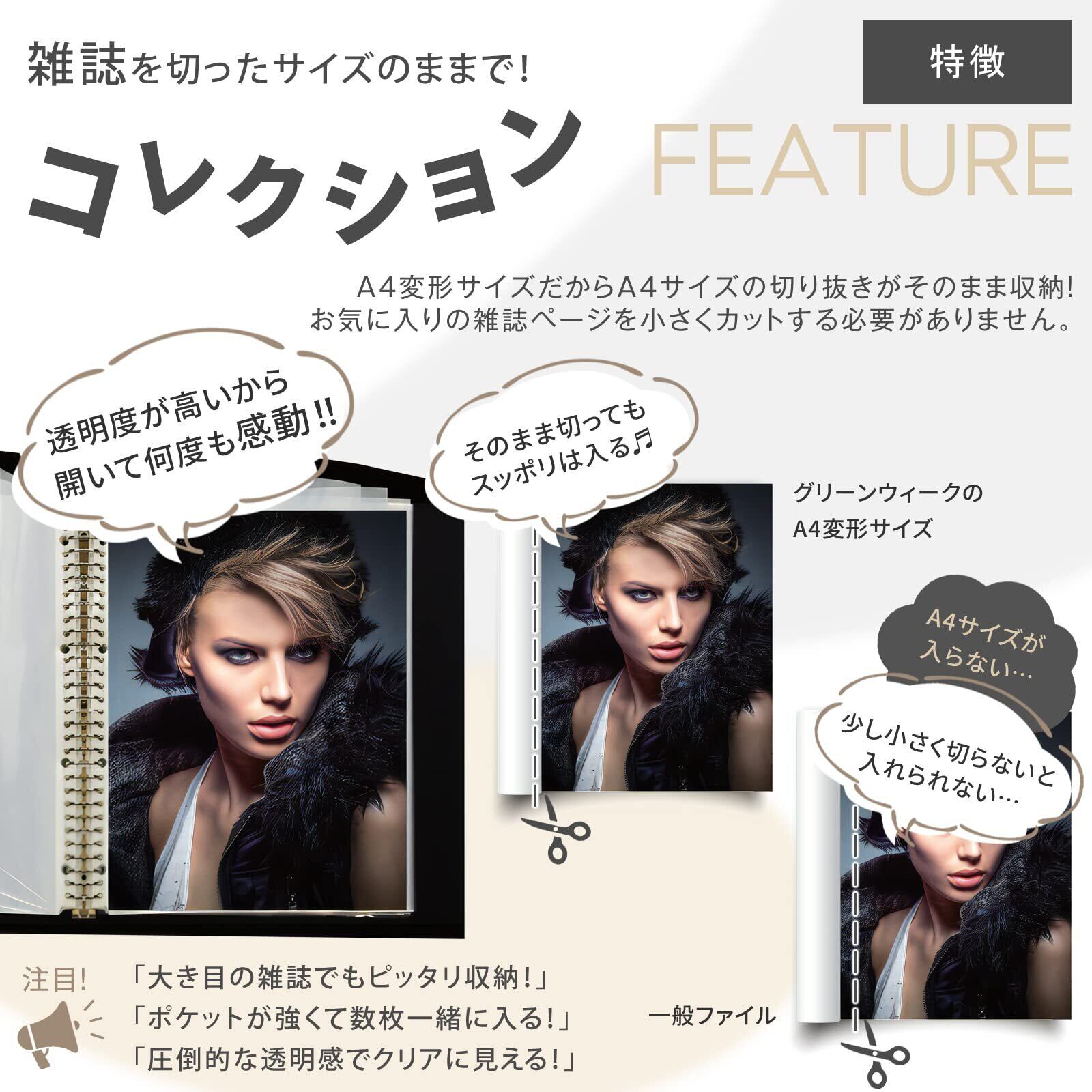 グリーンウィーク 雑誌 切り抜き マガジン クリア ファイル A4変形ワイド 30穴リング バインダー (クリアポケットリフィル30枚付属) 半透明